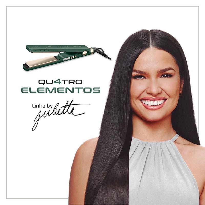 A Prancha Alisadora da Linha by Juliette Qu4tro Elementos traz um revestimento especial enriquecido com infusão de Cerâmica, Titânio, Tourmaline e Nano Silver. Esses 4 elementos, juntos, protegem seus fios e garantem uma aparência mais saudável aos cabelos, com brilho intenso, maciez e sem frizz.Revestimento especial com qu4tro elementos:- Cerâmica: Garante uma melhor distribuição do calor e contribui para um alisamento rápido e mais saudável.- Titânio: Tecnologia que age na umidade dos cabelos e reduz o tempo de alisamento, além de eliminar o efeito frizz. - Tourmaline: Fonte natural de íons negativos, que eliminam o frizz e garantem mais brilho.- Nano Silver: Partículas de prata que ajudam a inibir a ação de bactérias, contribuindo para a proteção dos fios e do couro cabeludo.Garanta agora mesmo mais beleza e praticidade em seus cabelos com a linha By Juliete!