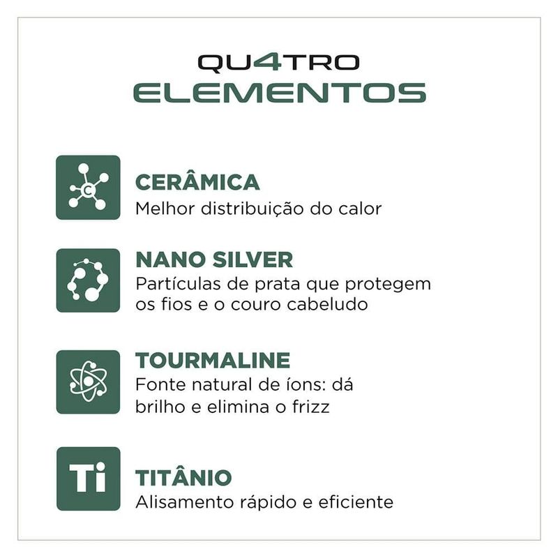 A Prancha Alisadora da Linha by Juliette Qu4tro Elementos traz um revestimento especial enriquecido com infusão de Cerâmica, Titânio, Tourmaline e Nano Silver. Esses 4 elementos, juntos, protegem seus fios e garantem uma aparência mais saudável aos cabelos, com brilho intenso, maciez e sem frizz.Revestimento especial com qu4tro elementos:- Cerâmica: Garante uma melhor distribuição do calor e contribui para um alisamento rápido e mais saudável.- Titânio: Tecnologia que age na umidade dos cabelos e reduz o tempo de alisamento, além de eliminar o efeito frizz. - Tourmaline: Fonte natural de íons negativos, que eliminam o frizz e garantem mais brilho.- Nano Silver: Partículas de prata que ajudam a inibir a ação de bactérias, contribuindo para a proteção dos fios e do couro cabeludo.Garanta agora mesmo mais beleza e praticidade em seus cabelos com a linha By Juliete!