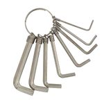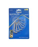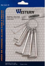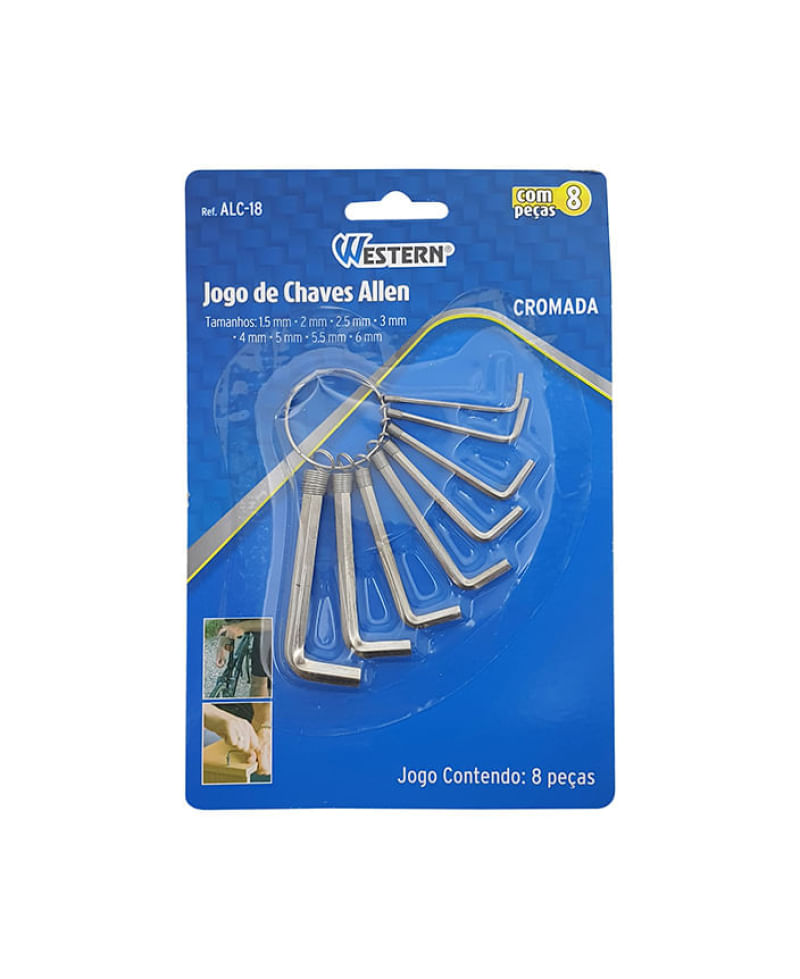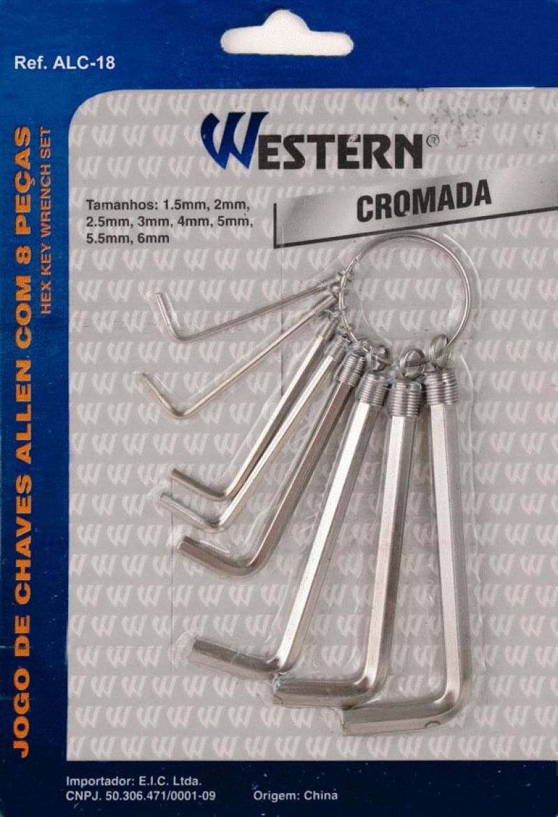 JOGO 8 CHAVES ALLEN 1,5MM A 6MM - Dimensões da Peça: • 1 Chave: 3,9 X 1,2 X 0,1cm • 1 Chave: 4,0 X 1,4 X 0,2cm • 1 Chave: 4,2 X 1,5 X 0,3cm • 1 Chave: 4,3 x 1,7 x 0,3cm • 1 Chave: 4,8 x 1,7 x 0,3cm • 1 Chave: 4,7 x 1,8 x 0,4cm • 1 Chave: 5,5 x 2 x 0,5cm • 1 Chave: 5,6 x 2,2 x 0,6cm - Dimensões da Embalagem: 19 x 13 x 1cm - Quantidade Inner: 60 peças - Dimensões Inner: 25 x 19,5 x 18,5cm - Quantidade Master: 120 peças - Dimensões Master: 40 x 27 x 21,5cm - Material: Aço carbono - Cor: Prata - Tipo de Embalagem: Blister - Marca: Western - Origem: China - Cromada. - Jogo contendo: 8 peças - Tamanhos: • 1,5 mm. • 2 mm. • 2,5 mm. • 3 mm. • 4 mm. • 5 mm. • 5,5 mm. • 6 mm. - Cuidados: • Para reduzir risco de lesões, sempre use adequadamente equipamentos de proteção individual (óculos de proteção, protetor auricuolar, luvas, etc...). Necessários ao trabalho. • Use o tipo e tamanho correto de ferramenta para cada tipo de trabalho. A ferramenta correta fará o trabalho melhor e mais seguro se utilizada para aquilo que foi projetada. • Não force a ferramenta. • Retire a ferramenta da tomada antes de instalar/ trocar qualquer acessório. • Leia o manual de instruções da sua ferramenta para instalar corretamente as pontas montadas. • Utilize a velocidade correta para cada tipo de trabalho. • Armazene em local limpo e seco, longe de umidade. • Guarde em local seguro. • Guarde estas instruções para futuras consultas. • Manter fora do alcance das crianças.