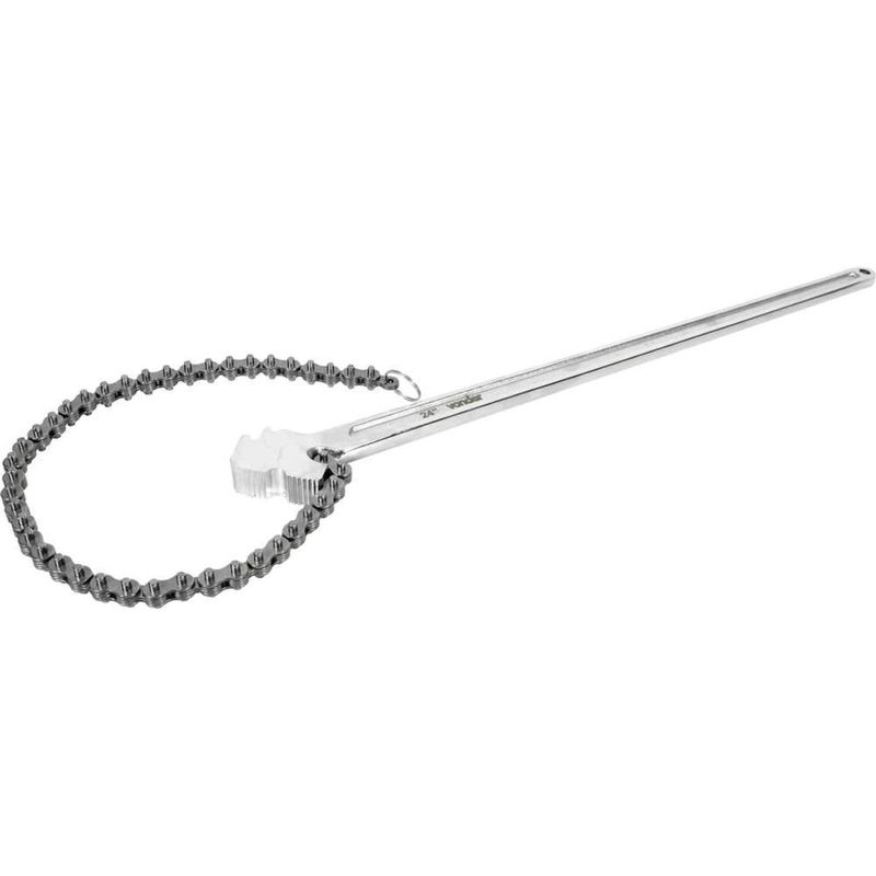 Chave de Corrente 24", Vonder OstenVonder - Conteúdo da embalagem: 1 Chave de corrente. Aplicação: Indicada para tubulações e filtros de óleo de até 170 mm. Destaques: Possui mordentes que prolongam a durabilidade da ferramenta. Referência: 3573124000 Garantia - E (CDC): Garantia legal: 90 dias Massa aproximada (peso): 1.583 kg Capacidade da chave de corrente: 170 mm Dimensões: Largura do mordente: 20,5 mm / Comprimento do corpo: 610 mm / Largura do cabo: 23 mm / Comprimento da corrente: 605 mm. Material: Aço carbono Destaques Comercial: Possui mordentes que prolongam a durabilidade da ferramenta. Aplicação Comercial: Indicada para tubulações e filtros de óleo de até 170 mm. Características Gerais do Produto: Garantia: • 3 Meses