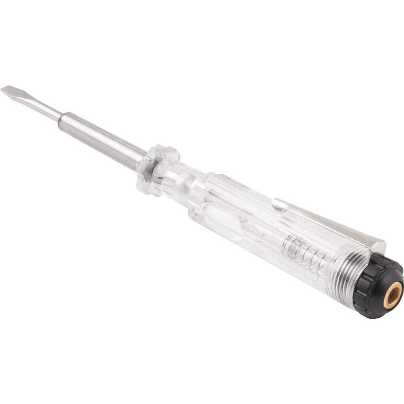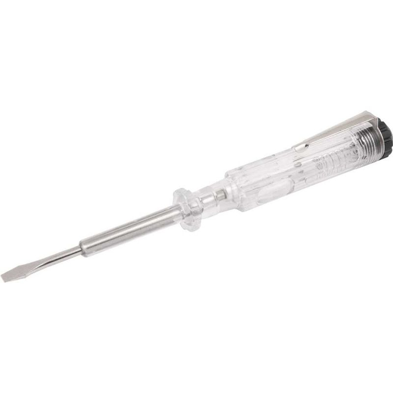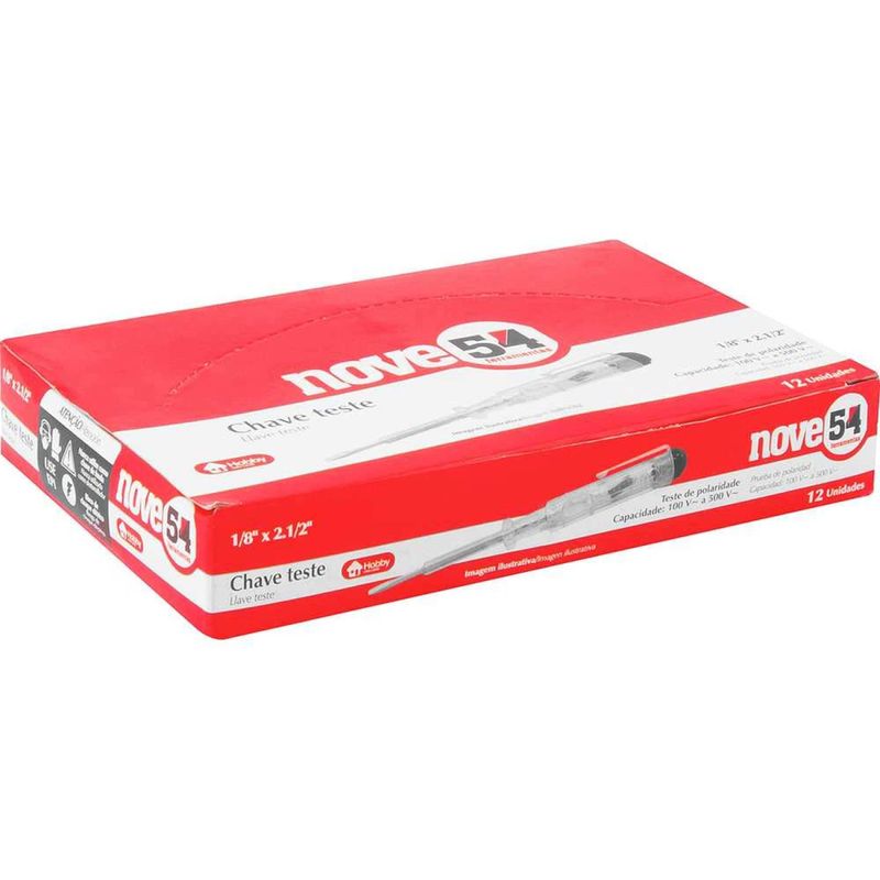 Chave Teste, Caixa com 12 Peças, Nove54 OstenVonder - Conteúdo da embalagem: 1 Caixa com 12 chaves teste. Aplicação: Indicada para verificar a existência de energia elétrica em fios, tomadas, entre outros, além de testar a polaridade. Não indicada para soltar ou apertar parafusos. Destaques: Possui haste niquelada, proporcionando maior resistência à oxidação/corrosão. Referência: 3571018140 Garantia - E (CDC): Garantia legal: 90 dias Largura da ponta: 1/8" - 3,18 mm Comprimento da haste: 2.1/2" - 63,5 mm Tensão de trabalho: 100 V~ a 500 V~ Material da haste: Aço carbono Acabamento da haste: Niquelado Material do cabo: Polipropileno Cor do cabo da chave: Transparente Massa aproximada (peso): 0.161 kg Destaques Comercial: Possui haste niquelada, resistente à oxidação e corrosão. Aplicação Comercial: Verifica presença de energia elétrica e polaridade em fios e tomadas; não serve para parafusos. Características Gerais do Produto: Garantia: • 3 Meses