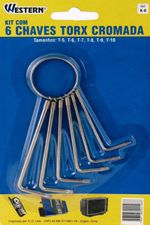 CHAVE TORX T5 A T10 6PC - Dimensões da Peça: - 1 Chave: 4,9 x 1,7 x 0,2cm - 1 Chave: 5,2 x 1,7 x 0,2cm - 1 Chave: 5,8 x 2,2 x 0,3cm - 1 Chave: 6,2 x 2,2 x 0,3cm - 1 Chave: 6,6 x 2,3 x 0,3cm - 1 Chave: 7 x 2,3 x 0,3cm - Dimensões da Embalagem: 11 x 1 x 17,5cm - Quantidade Inner: 30 Peças - Dimensões Inner: 17 x 12 x 16cm - Quantidade Master: 120 Peças - Dimensões Master: 24 x 19 x 36cm - Material: Aço carbono - Cor: Prata - Tipo de Embalagem: Blister - Marca: Western - Origem: China - Para: - Celulares, aparelhos eletrônicos e reparos em geral. - Jogo contendo: 6 Chaves Torx: - Tamanhos: T5 - T6 - T7 - T8 - T9 - T10. - Cuidados: - Para reduzir o risco de lesões, sempre use adequadamente equipamentos de proteção individual . (óculos de proteção, máscara, botas, luvas, etc...) Necessário ao trabalho. - Use a ferramenta correta para cada tipo de trabalho. Não force a ferramenta. A ferramenta correta fará o trabalho melhor e mais seguro se utilizada para aquiloGarantia do produto: 90 dias de garantia de acordo com o Código de Defesa do Consumidor + a Garantia do Fabricante