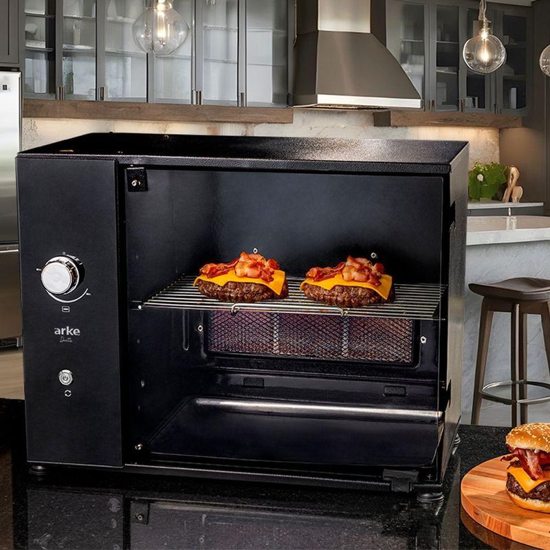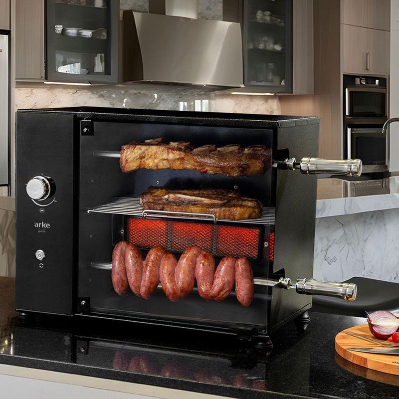 Churrasqueira A Gás GLP Rotativa Elétrica 2 Espetos + Grelha Acendimento Manual Duetto 110V ArkeA Churrasqueira Assador Rotativo Elétrico a Gás GLP Duetto é uma excelente opção para momentos descontraídos com a família ou grupo de amigos. Ela possui um sistema de rotação de espetos que permite assar de forma homogênea todos os tipos de carnes. Além disso, conta com um queimador infravermelho, que deixa seu alimento muito mais saboroso. Com seus pés antiderrapantes, proporciona segurança e estabilidade durante o uso. É produzida em aço carbono com pintura epóxi, o que garante maior durabilidade e facilita a limpeza.A churrasqueira também possui uma grelha em aço inox AISI 304, permitindo grelhar carnes, legumes e outros alimentos. Seu design funcional conta com um painel de vidro e botão de LED, conferindo maior elegância e sofisticação.Características:Produzido em Aço CarbonoPintura EpóxiPainel de VidroAcendimento ManualQueimador InfravermelhoGarantia de 6 mesesAlimentação a Gás P13 GLP (configurado conforme o tipo de gás escolhido; não pode ser utilizado com outro tipo de alimentação)Informações Técnicas:Altura: 42,6 cmLargura: 55,2 cmProfundidade: 33,5 cmPeso: 13,5 kgItens Inclusos:1 Churrasqueira Rotativa1 Bandeja Coletora de Gordura2 Espetos Simples1 Grelha4 Pés de Apoio em BorrachaManual de InstruçãoTempo Médio para Assar:Salsichão: 30 minCarne de Gado: 40 minCarne Suína: 50 minCarne de Frango em Pedaços: 50 min