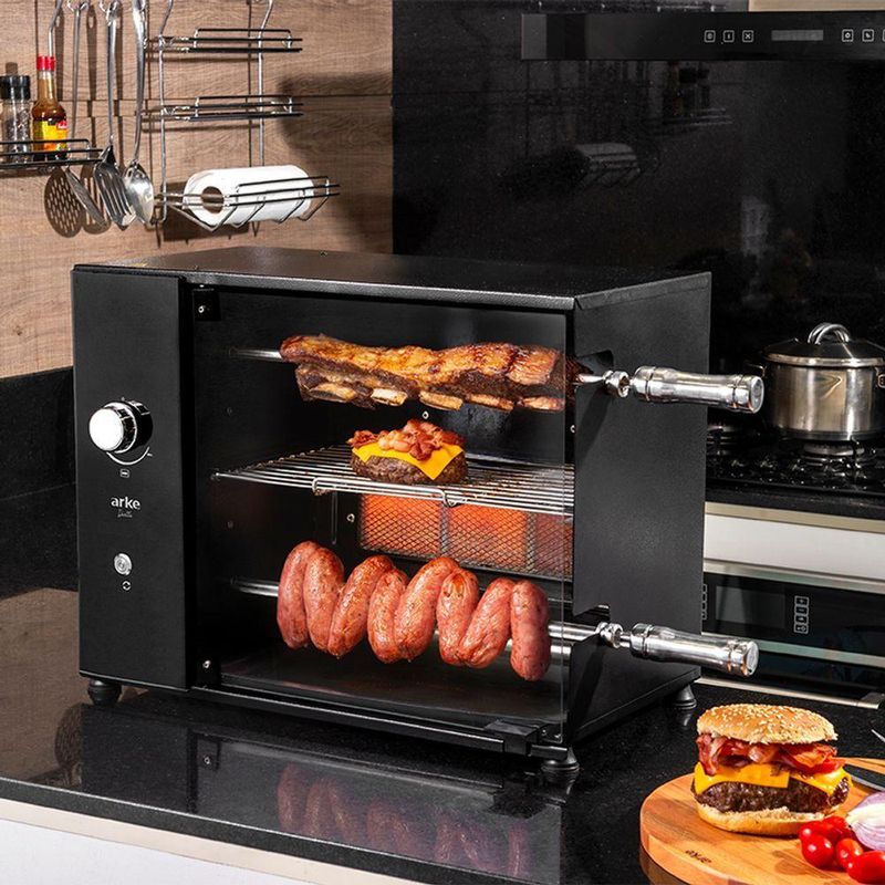 Churrasqueira A Gás GN Rotativa Elétrica 2 Espetos + Grelha Acendimento Manual Duetto 110V ArkeA Churrasqueira Assador Rotativo Elétrico a Gás GN Duetto é uma excelente opção para momentos descontraídos com a família ou grupo de amigos. Ela possui um sistema de rotação de espetos que permite assar de forma homogênea todos os tipos de carnes, além de um queimador infravermelho que deixa seu alimento ainda mais saboroso. Com pés antiderrapantes, proporciona segurança e estabilidade durante o uso. Produzida em aço carbono com pintura epóxi, oferece maior durabilidade e facilita a limpeza.A churrasqueira conta com uma grelha em aço inox AISI 304, permitindo grelhar carnes, legumes e outros alimentos. O produto é altamente funcional e tem um painel de vidro e botão de LED, proporcionando maior elegância e sofisticação.Características:Produzido em Aço CarbonoPintura EpóxiPainel de VidroAcendimento ManualQueimador InfravermelhoGarantia de 6 mesesAlimentação a Gás GN (configurado conforme o tipo de gás escolhido; não pode ser utilizado com outro tipo de alimentação)Informações Técnicas:Altura: 42,6 cmLargura: 55,2 cmProfundidade: 33,5 cmPeso: 13,5 kgItens Inclusos:1 Churrasqueira Rotativa1 Bandeja Coletora de Gordura2 Espetos Simples1 Grelha4 Pés de Apoio em BorrachaManual de InstruçãoTempo Médio para Assar:Salsichão: 30 minCarne de Gado: 40 minCarne Suína: 50 minCarne de Frango em Pedaços: 50 min