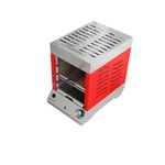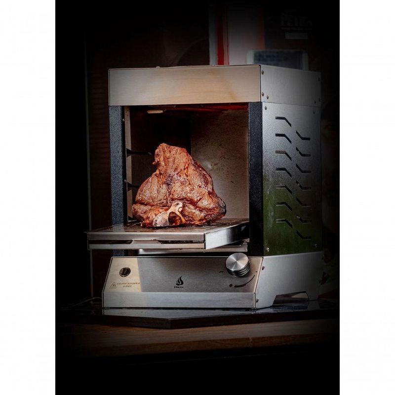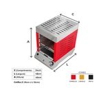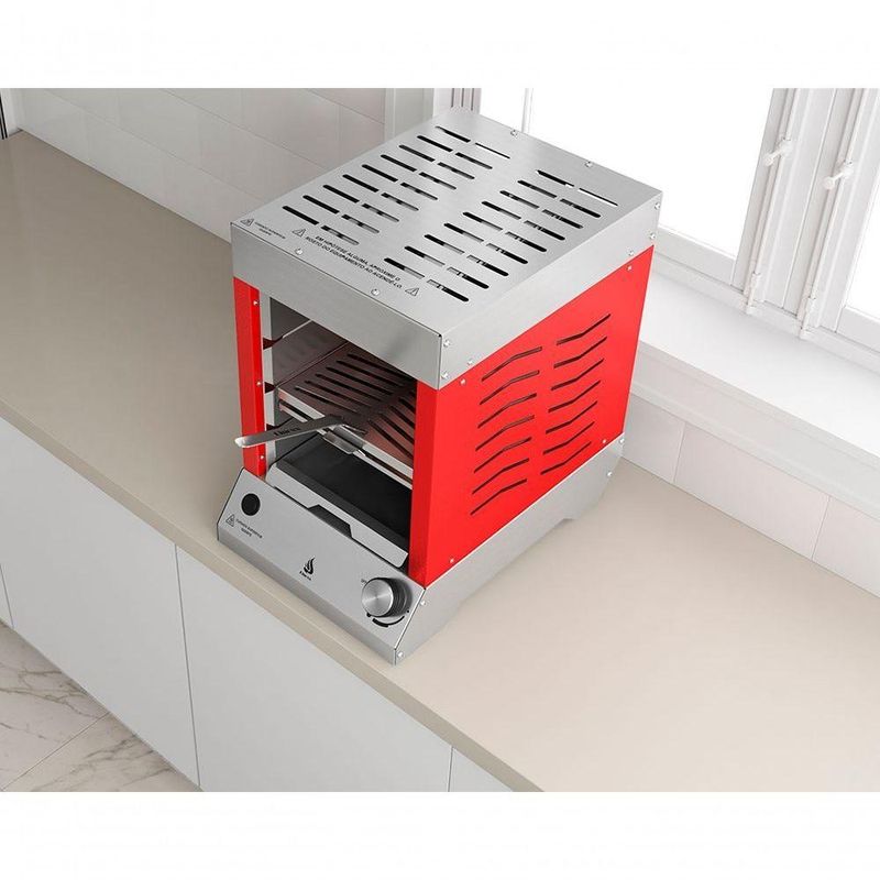Churrasqueira A Gás Vertical Sem Fumaça Flame Dinoxx VermelhaQue tal aquele grelhado rápido? Conheça a poderosa Flame!Você deve se perguntar: afinal, fazendo uma comparação com as churrasqueiras tradicionais (Carvão) o assado ou grelhado tem o mesmo sabor? E o poder calorífico, é suficiente para um bom assado de acordo com o ponto desejado?Com certeza podemos afirmar que sim! A propósito, nossa qualidade está sendo certificada dia a dia por milhares de clientes satisfeitos por todo o Brasil.Benefícios da churrasqueira:Churrasqueira a gás portátil: dispensa montagens, obras e instalação, já vem pronta! Basta apoiar em sua bancada e começar a usar;Assa um delicioso churrasco com pouquíssimo trabalho e produz o mínimo de fumaça, dispensando até a coifa, na grande maioria dos ambientes;Fabricada 100% em aço inox;Acessórios e grelhas removíveis;Design minimalista;Praticidade na limpeza;Válvula de segurança corta gás (Safe Stop).Especificações técnicas:100% em aço inox Aço inox 304:Estrutura superior, bandeja coletora de gordura e base.Aço Inox 430:Estrutura pintada;02 queimadores a gás infravermelho (geração de energia por queimador 2250 Kcal/h);01 botão com regulagem de temperatura dos queimadores;Pressão de trabalho do queimador: GLP botijão 2,8 Kpa - GLP encanado 2,5 Kpa - GN encanado 1,25 Kpa;Bicos injetores com Ø de 1,00mm gás GLP e 1,4mm gás GN;Sistema Safe Stop (Válvula de segurança corta gás);Acendimento automático (Pilha).