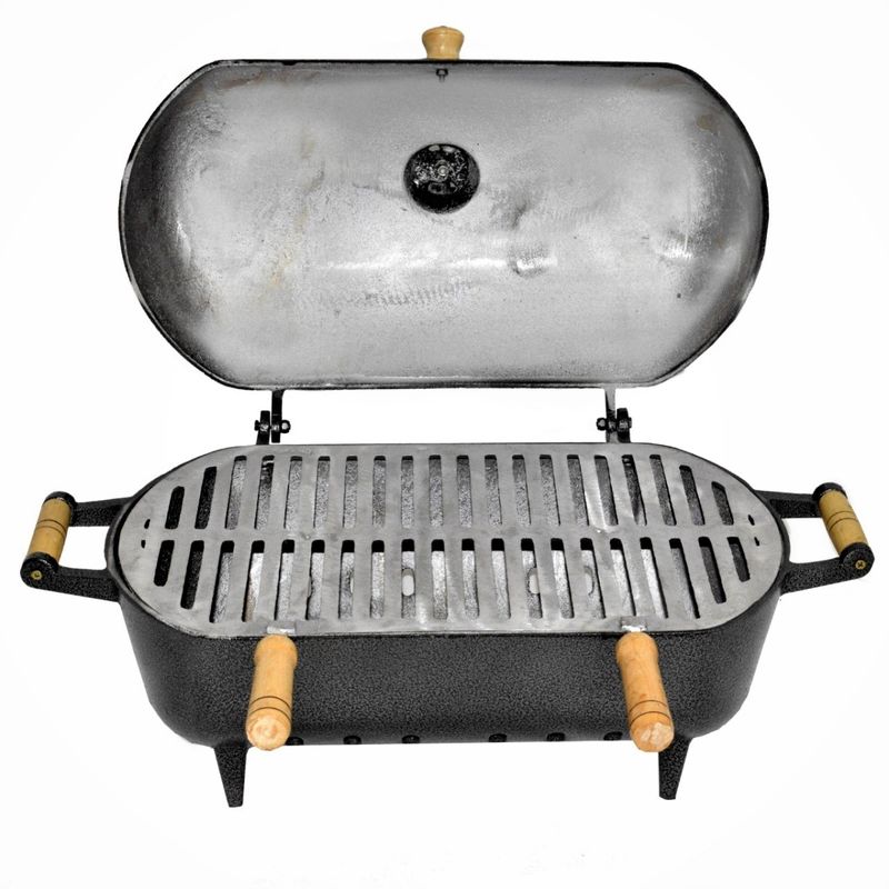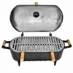 Churrasqueira Alumínio Fundido Grosso Craqueada a Bafo Preta Churrasqueira a bafo de alumínio fundido, com grelha de alumínio fundido e alça de madeira, conta também com chaminé na tampa superior para saída de fumaça, que pode ser fechada. Portátil e compacta, ideal para camping, bares, barcos, apartamentos, varandas, cozinhas e áreas de lazer em grande ou pequeno espaço, possui um rápido aquecimento que proporciona economia de carvão. Exclusivo mecânismo para fechamento da chaminé. Especificações Técnicas Churrasqueira: Comprimento Total ( Alça a Alça ): 59cm. Altura do Fundo até a Grelha: 15cm. Comprimento da Grelha: 47cm. Largura Churrasqueira: 27cm. Altura Churrasqueira: 30cm. Largura da Grelha: 26cm. Peso: 5,800Kg. Itens Inclusos: 01 Churrasqueira Alumínio Fundido Grosso Craqueada a Bafo Preta. Código: 01555.CRAQPRETA.