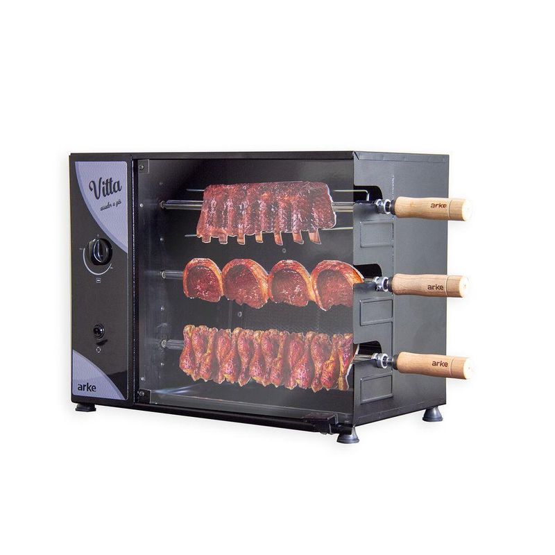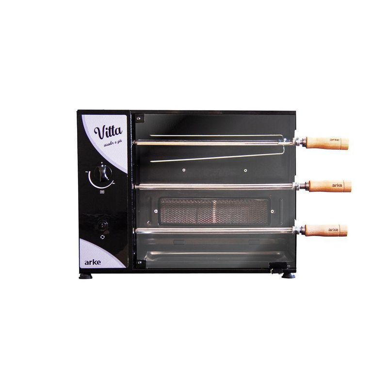 Churrasqueira Assador A Gás Glp Rotativa Elétrica 55 Cm Aço Carbono Infravermelho Vitta3 220v - ArkeA Churrasqueira Assador Rotativo Elétrico a Gás GLP Compacto VITTA-03 é uma ótima opção para momentos descontraídos com a família ou grupo de amigos. Ela possui um sistema de rotação de espetos que permite assar de forma homogênea todos os tipos de carnes. Possui queimador infravermelho que deixa seu alimento muito mais saboroso. Com seus pés, proporciona segurança e estabilidade na hora de usar o produto, além de ser produzida em aço carbono com pintura epóxi fazendo com que tenha uma maior durabilidade e tornando a limpeza mais fácil e flexível. Arke o gostoso sabor da vida! - Produzido em Aço Carbono - Pintura Epóxi - Acendimento Manual - Queimador Infravermelho - Garantia 6 Meses - Alimentação a Gás P13 GLP *O Assador é configurado conforme o tipo de gás escolhido e não pode ser utilizado com outro tipo de alimentação. Informações Técnicas: Altura: 42,5 Cm Largura: 55 Cm Profundidade: 39 Cm Peso: 15 Kg Itens Inclusos: - 1 Churrasqueira Rotativa - 1 Bandeja Coletora de Gordura - 2 Espetos Simples - 1 Espeto Triplo - 4 Pés de Apoio já acoplados no produto - Manual de Instrução Tempo Médio para Assar: Salsichão - 30 min Carne de gado - 40 min Carne suína - 50 min Carne de frango em pedaços - 50 min
