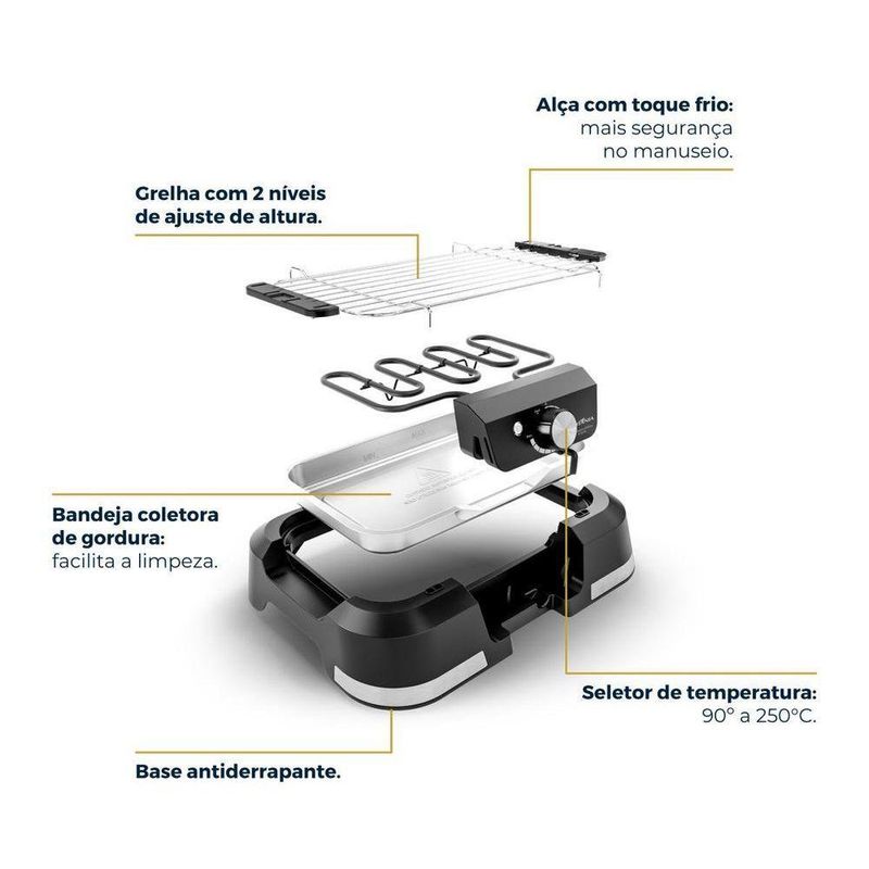Churrasqueira Elétrica Britânia 1500W Menos Fumaça BCQ10A 110VDescubra a praticidade e a versatilidade da Churrasqueira Elétrica Britânia 1500W Menos Fumaça BCQ10A!Os incríveis 1500W de potência, garante preparos mais rápidos em menor tempo. Além disso, o seletor de temperatura ajustável até 250°C, permite o ajuste de acordo com a necessidade, para que seus legumes e carnes estejam sempre no ponto certo. Além disso, a grade removível com alça é desmontável e facilita a limpeza, podendo ser lavada em água corrente sem esforço. A grelha da Churrasqueira Elétrica Britânia vem com ajuste de altura em dois níveis, permitindo que cozinhe diferentes tipos de alimentos com perfeição. Já as alças laterais com toque frio proporcionam segurança e praticidade no manuseio, evitando acidente e queimaduras. Conta ainda com bandeja coletora de gordura, que reduz a emissão de fumaça, ideal para uso interno. Prepare seus alimentos de maneira mais saudável e ajustada às suas preferências com a Churrasqueira Elétrica Britânia 1500W Menos Fumaça BCQ10A! Principais Características:- Controle de temperatura- Temperatura máxima de 250°C- Luz indicadora de funcionamento- Grelha removível com alça- Dimensões da grelha: 31cm x 17cm- Grelha possui regulagem com 2 níveis de altura- Material da grelha: aço cromado- Bandeja para água com capacidade de 1L- Dimensões da bandeja 33,2cm x 20cm- Resistência removível- Pés antiderrapantes.Especificações Técnicas:Marca: PhilcoModelo: BCQ10ACor: PretoEstado: NovoPotência (W): 1500Consumo (kW/h): 1,5Tipo superficie: RetaAltura do produto: 9 cmLargura do produto: 40 cmComprimento do produto: 29 cmPeso do produto: 1,3 kgAltura com embalagem: 30,8 cmLargura com embalagem: 41,6 cmComprimento com embalagem: 8,5 cmPeso com embalagem: 1,67 kgGarantia (Dias): 360Observação: Somente faturamos para o nosso consumidor final, ou seja, não faturamos pedidos para CNPJ por este portal de vendas.