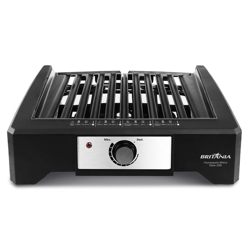 Churrasco saboroso é com a Churrasqueira Elétrica Britânia BCQ2000 Flame! Ela possui grelha argentina e inclinação e formato especial que facilitam o escoamento da gordura. Além de quase não emitir fumaça e ser ideal para qualquer ambiente, ela é muito fácil de limpar. A Churrasqueira Elétrica Britânia BCQ2000 atinge altas temperaturas possibilitando o preparo de diversos alimentos em poucos minutos. Já o seletor de temperatura deixa a carne selada e no ponto que você deseja com menos fumaça. Os almoços de domingo estão garantidos! Ela conta ainda com revestimento que garante durabilidade, com dupla camada antiaderente. E para maior segurança no manuseio, a alça da Churrasqueira Elétrica tem toque frio e base antiderrapante. Churrasqueira Elétrica Britânia BCQ2000 garantia de churrasco saboroso a qualquer momento. • Ideal para preparar churrasco • Controle de temperatura • Luz indicadora de funcionamento • Grelha Antiaderente removível • Grelha tipo Argentina • Bandeja coletora de resíduos com capacidade de 1 litro • Pés antiderrapantes • Area da grelha: 992 cm² • Material: metal e plástico.