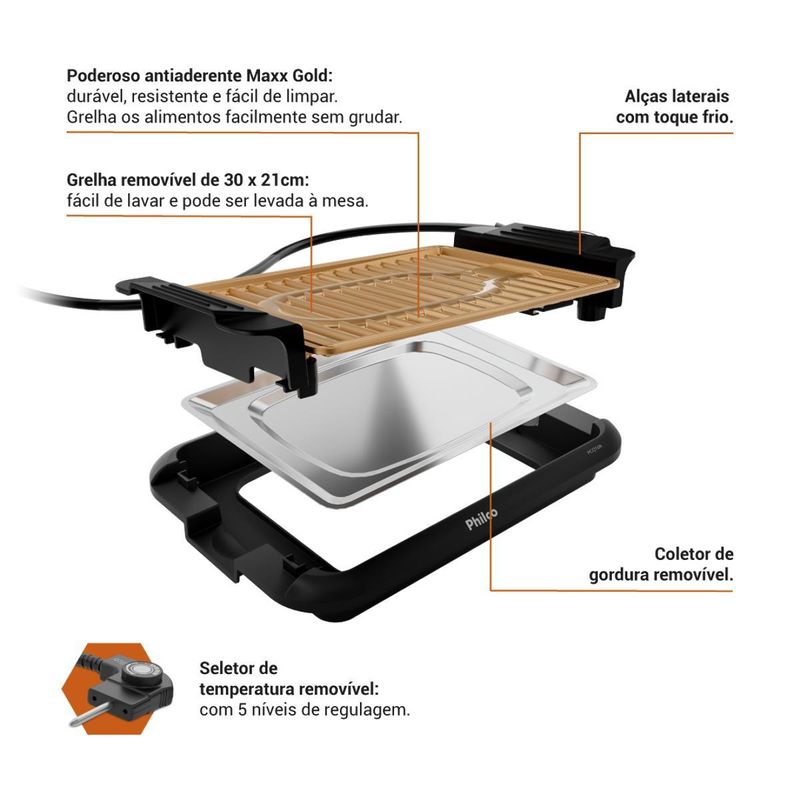 Descubra o prazer de preparar churrascos suculentos sem sair de casa, mesmo em ambientes compactos. A Churrasqueira Elétrica Philco 1200W une potência e design inteligente para quem busca praticidade sem abrir mão do sabor. Com tecnologia antiaderente e segurança reforçada, ela é a solução ideal para apartamentos, pequenas famílias ou até negócios gastronômicos que desejam oferecer pratos impecáveis. Com 1200W de potência, você grelha carnes, legumes ou hambúrgueres em minutos, mantendo os nutrientes e o suco natural dos alimentos. A grelha Antiaderente Gold elimina a preocupação com comida grudada, garantindo uma limpeza rápida e descomplicada. Os 5 níveis de temperatura permitem ajustar o cozimento conforme cada receita: de pães dourados a carnes seladas. A estrutura desmontável e fácil de armazenar cabe em qualquer armário, enquanto as alças com toque frio garantem segurança ao manusear o aparelho, mesmo após horas de uso. Com 30cm x 21cm de área útil, a churrasqueira acomoda porções generosas sem ocupar espaço excessivo, ideal para sua cozinha. Não deixe o espaço limitado impedir seus momentos de prazer. Compre e leve para casa a Churrasqueira Elétrica Antiaderente Philco PCQ10A: eficiência, segurança e sabor em um único equipamento. • Potência: 1200W • Dimensional da grelha: 30 x 21cm • Seletor de temperatura com 5 níveis de ajuste • Grelha removível • Pés antiderrapantes • Alças laterais • Grelha de Alumínio com revestimento antiaderente GOLD • Funcionamento Elétrico • Luz indicadora de Funcionamento • Bandeja de água/Coletor de gordura: 650ml • Cordão removível • Grelha na cor dourada