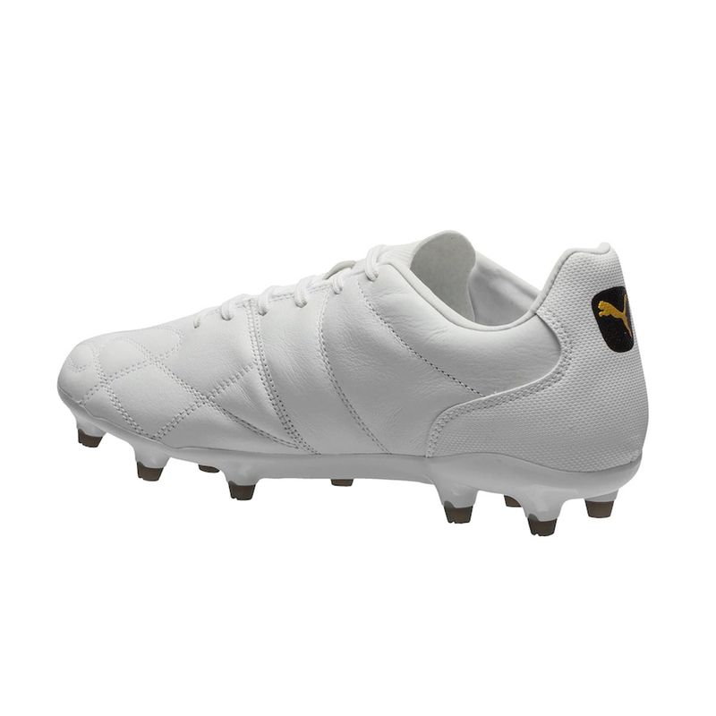 Descrição:Passe a ser o rei dos gramados com a Chuteira Campo Puma King FG BDP. Seu cabedal de qualidade produzido em couro é durável e confortável. O produto possui fechamento por cadarço, auxiliando o ajuste aos pés. A palmilha removível é ideal para a higienização. Solado em TPU com travas posicionadas estrategicamente para mais tração e força nos gramados. Design elegante em uma vibe clássica na cor predominante branca e a icônica faixa Formstrip em preto. Detalhes da marca em dourado. Referência: 106455.
