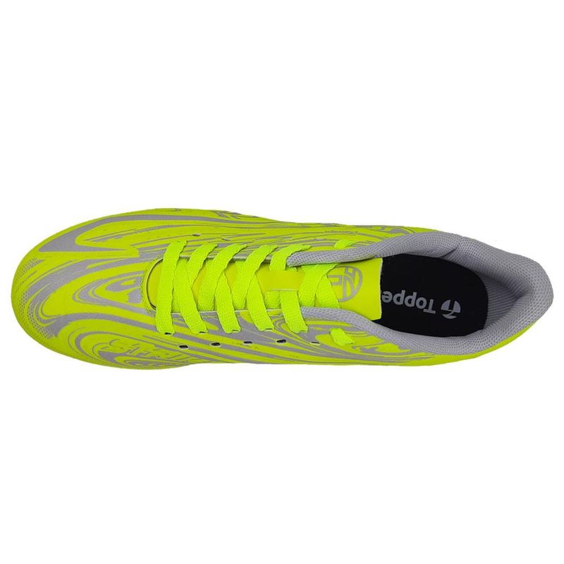 DescriçãoA Chuteira Campo Topper Strike V Unissex é perfeita pra quando você for marcar aquele gol de placa que leva seu time e a plateia a loucura, com a Chuteira Campo Topper Strike V! Com solado emborrachado que garante estabilidade durante as jogadas, essa chuteira campo unissex apresenta cabedal em sintético com a tecnologia T-Adapt que se adapta ao formato do seu pé, permitindo maior conforto e firmeza, durabilidade e maciez durante os chutes. Já no seu solado se faz presente a tecnologia do Flexzone que são pequenos canais que auxiliam na flexão do pé e transição de pisada, com solado flexível que auxilia na estabilidade.Modelo: Strike V Campo;Cor: Amarelo Neon;Gênero: Unissex;Marca: Topper;Composição: Sintético;Tecnologias: Flexzone, T-Adapt;Tipo de Pisada: Neutra;Tabela de MedidasComprimento da palmilha interna:Tamanho 36: 24 cm;Tamanho 37: 24,8 cm;Tamanho 38: 25,3 cm;Tamanho 39: 26 cm;Tamanho 40: 26,5 cm;Tamanho 41: 27,5 cm;Tamanho 42: 28 cm;Tamanho 43: 29 cm;Tamanho 44: 29,5 cm.