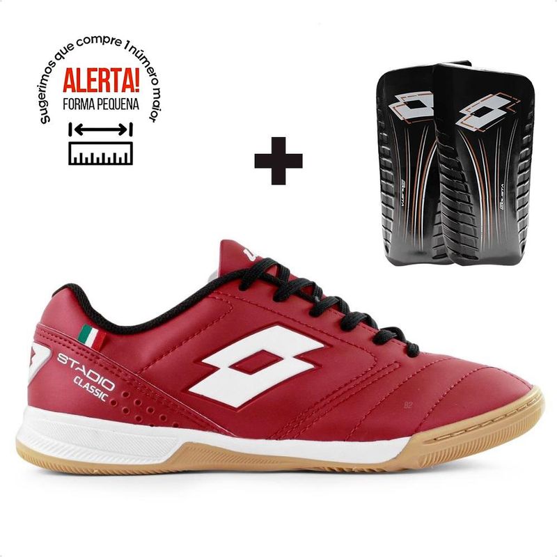 Chuteira Futsal Lotto Stadio Classic B700 Masculina + Caneleira Este é um produto original Lotto com garantia vendido pela B2 Online.A Chuteira Futsal Lotto Stadio Classic B700 Masculina é a escolha perfeita para jogadores que buscam um calçado que combine estilo, conforto e desempenho nas quadras Confeccionado em material de alta qualidade, o cabedal garante durabilidade e um toque suave na bola, proporcionando maior precisão nos passes e chutes.Palmilha em EVA oferece excelente amortecimento e conforto, reduzindo o impacto e proporcionando maior bem-estar durante o jogo.Solado de borracha de alta resistência à abrasão é especialmente projetado para as quadras, oferecendo tração e estabilidade excepcionais em todas as direções.O design clássico e elegante da chuteira Lotto Stadio Classic B700 a torna versátil, podendo ser utilizada tanto em jogos quanto em treinos.Favor consultar nossa tabela de numeração e tamanho. Recomendamos escolher um ou dois números acima do seu tamanho habitual.Acompanha uma Caneleira Futebol Lotto Solista • Gênero: Masculino• Indicado para Futebol de Salão/Futsal• Feito de material sintéticо• Modelo com cadarço para melhor ajuste no pé• Nacional Foto do produto condiz com a realidade. Não existe variação significativa de cor entre o produto real e a foto. Edição realizada em programa gráfico para aproximar ao máximo a foto à cor real do produto.