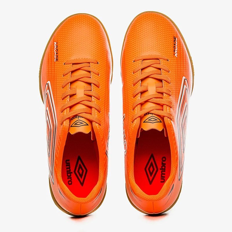U01FB00155_667_1168735 A Chuteira Futsal Arcade segue um design ousado e moderno, inspirado nas tendências do público jovem, com arte gráfica exclusiva em cores vivas em ton sur ton. Ideal para os jogadores que querem se destacar dentro das quadras com o melhor do estilo e qualidade Football da Umbro. Cabedal simétrico confeccionado em material laminado com forro em poliéster. Possui arte gráfica em ton sur ton com efeito de textura 3D, Diamante Umbro Outline personalizado em destaque na lateral, assinatura Arcade aplicada na parte frontal e palmilha macia em EVA com poliéster forrado. O solado de futebol indoor é construído todo em borracha para maior aderência ao solo durante os jogos. Categoria: Football Boots Gênero: Masculino Cor: Laranja/Laranja Fluor/Azul Marinho Detalhes do produto: CABEDAL: 100% - SINTETICO FORRO: 100% - POLIESTER PALMILHA: 90% - EVA 10% - POLIESTER SOLA: 100% - BORRACHA Medidas: Tamanho 37 - Comprimento 24,60cm Tamanho 38 - Comprimento 25,27cm Tamanho 39 - Comprimento 25,93cm Tamanho 40 - Comprimento 26,60cm Tamanho 41 - Comprimento 27,27cm Tamanho 42 - Comprimento 27,93cm Tamanho 43 - Comprimento 28,60cm Tamanho 44 - Comprimento 29,26cm