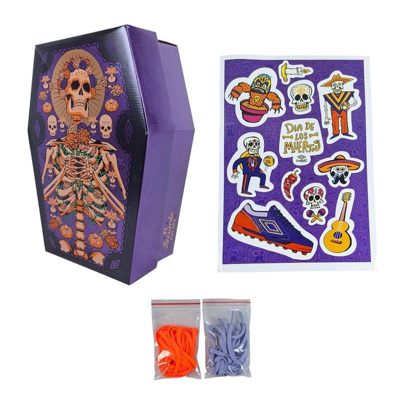 DescriçãoChuteira Umbro Pro 5 Bump DLM – Estilo, desempenho e homenagem ao Dia de Los MuertosA Chuteira Umbro Pro 5 Bump DLM foi desenvolvida para quem busca qualidade, conforto e performance nas quadras, com um design exclusivo inspirado no Dia de Los Muertos. Seu visual marcante celebra a data com detalhes únicos e caixa personalizada, que ainda acompanha cartela de adesivos, cartaz temático e dois cadarços extras nas cores lilás e laranja.O cabedal em couro natural com costuras frontais garante durabilidade e controle de bola aprimorado, enquanto a biqueira em camurça reforçada protege as áreas de maior desgaste. O tecido em mesh fusionado oferece respirabilidade e conforto térmico.Com palmilha em EVA para amortecimento eficaz e entressola com tecnologia BUMP, a chuteira proporciona alto retorno de energia e impacto reduzido. A sola em borracha bicolor antiderrapante, com costura de reforço frontal, garante aderência, estabilidade e segurança em cada jogada.Umbro Pro 5 Bump DLM – a chuteira futsal ideal para quem busca estilo, desempenho e tecnologia com uma homenagem especial ao Dia de Los Muertos.Modelo: Pro 5 Bump;Marca: Umbro;Gênero: Adulto;Cor: Roxo Laranja;Tecnologias: BUMP;Composição: Cabedal em 40% Couro, 40% Couro Sintético e 20% Poliéster, Forro 100% Poliéster, Palmilha 90% EVA, 10% Poliéster, Sola 60% Borracha e 40% EVA ;Tipo de Pisada: Neutra;Tabela de MedidasComprimento da palmilha interna:Tamanho 34: 22,5cm;Tamanho 35: 23,5cm;Tamanho 36: 24cm;Tamanho 37: 24,5m;Tamanho 38: 25cm;Tamanho 39: 25,5cm;Tamanho 40: 26,5cm;Tamanho 41: 27,5m;Tamanho 42: 28cm;Tamanho 43: 29cm;