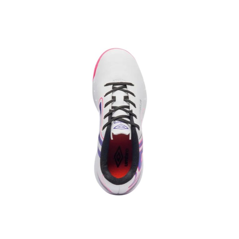 A chuteira de Futebol de Salão Umbro Pro 5 Júnior foi desenvolvido para oferecer bem-estar e qualidade superior aos jovens atletas que procuram aprimorar seu desempenho em quadra. Seu corpo superior, com design não simétrico, é construído em material sintético emborrachado e laminado, apresentando uma estampa exclusiva. Ele possui um sistema de amarração clássico (lingueta tradicional) e exibe o icônico Diamante da Umbro estampado na lateral por meio de serigrafia. O solado específico para futsal conta com uma entressola incrivelmente suave de EVA, que se estende por toda a sua extensão, e uma base (soleta) de borracha com propriedades antiderrapantes, garantindo tanto a resistência do calçado quanto a aderência necessária ao piso. Composição: Revestimento Externo (Cabedal): 100% - Sintético Forro/Palmilha: 100% - Poliéster Sola: 60% - EVA | 40% - Borracha
