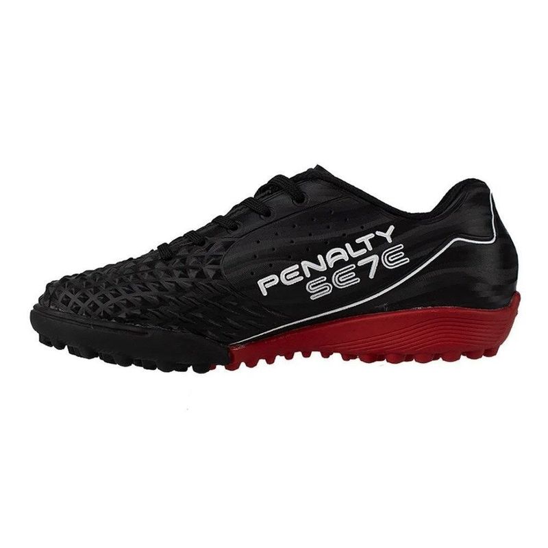Descrição:Com a Chuteira Society Penalty Se7e Kids XXI os pequenos se tornarão as estrelas nos campos de gramado sintético. Trazendo o cabedal produzido em material sintético, o artigo proporciona maior resistência ao desgaste, viabilizando uma maior durabilidade. Conta com solado completamente emborrachado, trazendo a presença de travas baixas e fixas, garantindo assim, maior aderência e tração nos gramados sintéticos. Com o fechamento realizado por cadarço, a peça garante um ajuste perfeito. Já as palmilhas, são fabricadas em EVA, além de serem removíveis, facilitando sua higienização. Seu design predominantemente em preto conta com símbolo da fabricante em branco, além de parte de seu solado ser na cor vermelho. Referência: 246215.9850.
