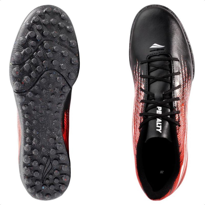 Chuteira Society Penalty Tornado Masculina + Bomba Este é um produto original Penalty com garantia vendido pela B2 Online.Para quem busca o melhor desempenho nas partidas de Society, a Chuteira Society Penalty Tornado é a escolha ideal.Desenvolvida com solado em borracha de alta durabilidade, essa Chuteira Society oferece tração excelente em gramados artificiais, permitindo arrancadas rápidas e mudanças de direção precisas.Possui tecnologia Hiperflex no solado, que proporciona flexibilidade superior, permitindo movimentos mais ágeis e naturais, essenciais para dribles e mudanças de direção rápidas.Cabedal em Micropower oferece resistência e conforto, ajustando-se perfeitamente ao formato do pé, proporcionando controle de bola preciso e uma sensação de leveza.Palmilha em EVA plana de 3,5 mm oferece conforto e absorção de impacto, proporcionando suporte extra para seus pés, mesmo nas partidas mais intensa.Escolha a Chuteira Society Penalty Tornado e leve sua performance ao próximo nível com o melhor em tecnologia e conforto. Acompanha 1 Bomba Penalty• Gênero: Masculina • Indicado para Futebol Society• Cabedal: Micropower• Tecnologia do Solado : Hiperflex• Produto NacionalFoto do produto condiz com a realidade. Não existe variação significativa de cor entre o produto real e a foto. Edição realizada em programa gráfico para aproximar ao máximo a foto à cor real do produto.
