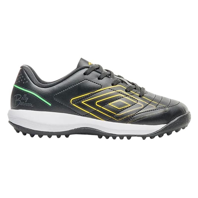 Descrição:Com visual marcante e performance garantida, a Chuteira Umbro BR Futsal Society é a pedida certa para os pequenos craques dominarem o jogo. Em parceria com o influenciador Billy, do canal BRFUTSAL, o modelo apresenta cabedal sintético durável, design moderno nas cores preta e amarela e solado com micro travas fixas, ideal para grama sintética. Confortável e funcional, acompanha o ritmo acelerado das partidas no society. INFORMAÇÕES TÉCNICAS: - Cabedal: Sintético durável - Forro: Têxtil acolchoado - Palmilha: EVA forrada e removível - Lingueta: Fina e flexível - Solado: Borracha com micro travas fixas - Fechamento: Cadarço - Gênero: Infantil - Indicado para: Society TECNOLOGIA: - Bump: Proporciona amortecimento, impulsão e retorno de energia a cada movimento.