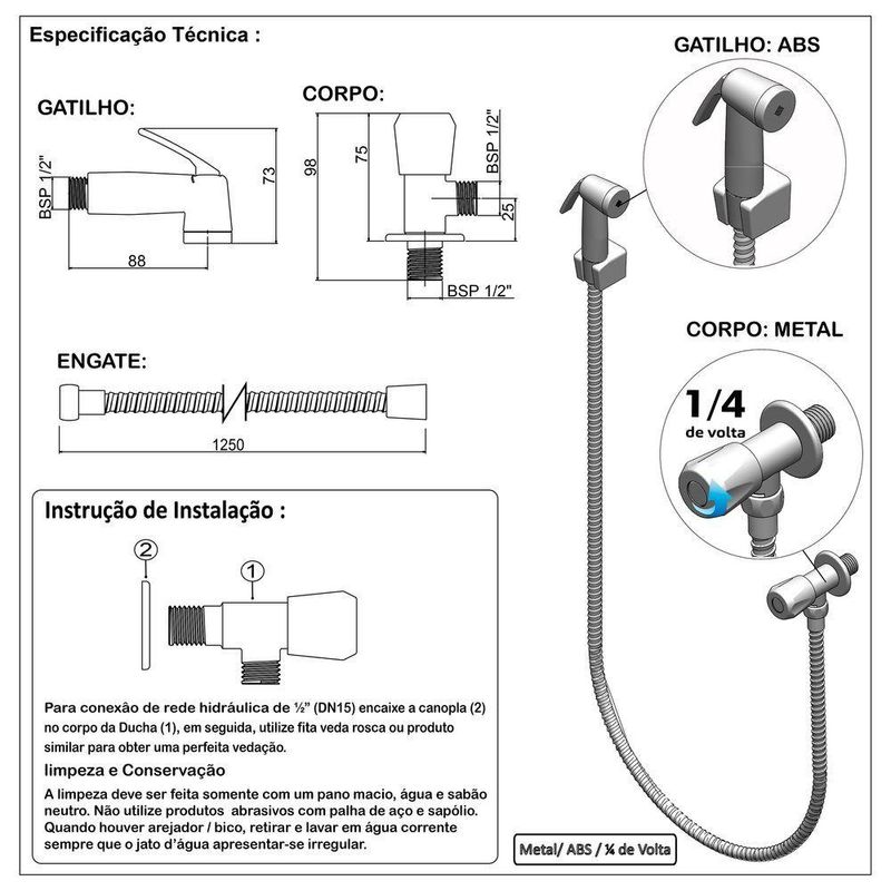Chuveirinho Ducha Higiênica Gatilho Metal Cromado 1/4 VoltaDucha higiênica banheiro metal cromado, possui acionamento 1/4 volta prático de abertura e fechamento no registro com mangueira flexível em metal de 1,20 metros de comprimento, sendo uma das características que garante qualidade e durabilidade para o produto, seu gatilho é cromado e possui grande resistência a corrosão com um acionamento manual via botão, de fácil manueio!- Material do registro: 100% metal cromado.- Material do gatilho: ABS cromado de alta resistência e qualidade- Acessórios para instalação incluso: acompanha suporte em ABS para apoiar o gatilho, bucha e parafuso- Fácil instalação- Bitola de entrada de água: 1/2 polegada- Mangueira flexível de longo alcance com 1,20 mts metal cromado-Utilização: banheiro ou salão de beleza- 5 anos de garantia- Acabamento moderno- Registro 1/4 VoltaAPÓS O USO, SEMPRE FECHAR O REGISTRO DA DUCHA, DEVIDO A VARIAÇÃO DE PRESSÃO DE CADA LOCAL DE INSTALAÇÃO.Ducha higiênica banheiro metal cromado, possui acionamento 1/4 volta prático de abertura e fechamento no registro com mangueira flexível em metal de 1,20 metros de comprimento, sendo uma das características que garante qualidade e durabilidade para o produto, seu gatilho é cromado e possui grande resistência a corrosão com um acionamento manual via botão, de fácil manueio!- Material do registro: 100% metal cromado.- Material do gatilho: ABS cromado de alta resistência e qualidade- Acessórios para instalação incluso: acompanha suporte em ABS para apoiar o gatilho, bucha e parafuso- Fácil instalação- Bitola de entrada de água: 1/2 polegada- Mangueira flexível de longo alcance com 1,20 mts metal cromado-Utilização: banheiro ou salão de beleza- 5 anos de garantia- Acabamento moderno- Registro 1/4 VoltaAPÓS O USO, SEMPRE FECHAR O REGISTRO DA DUCHA, DEVIDO A VARIAÇÃO DE PRESSÃO DE CADA LOCAL DE INSTALAÇÃO.