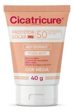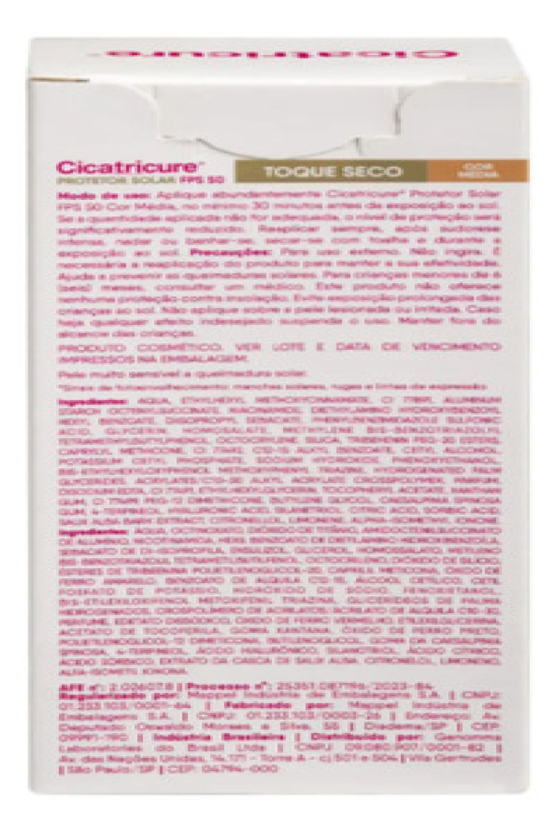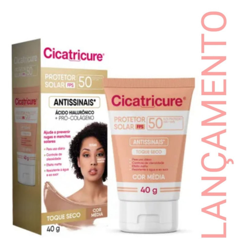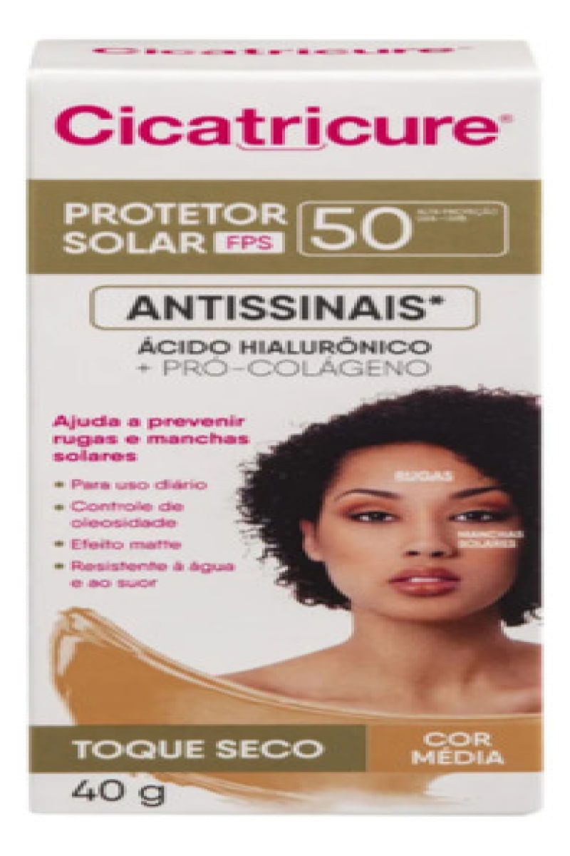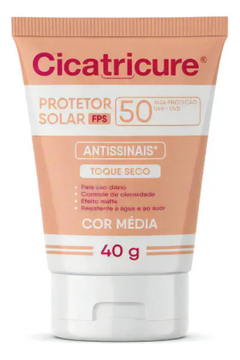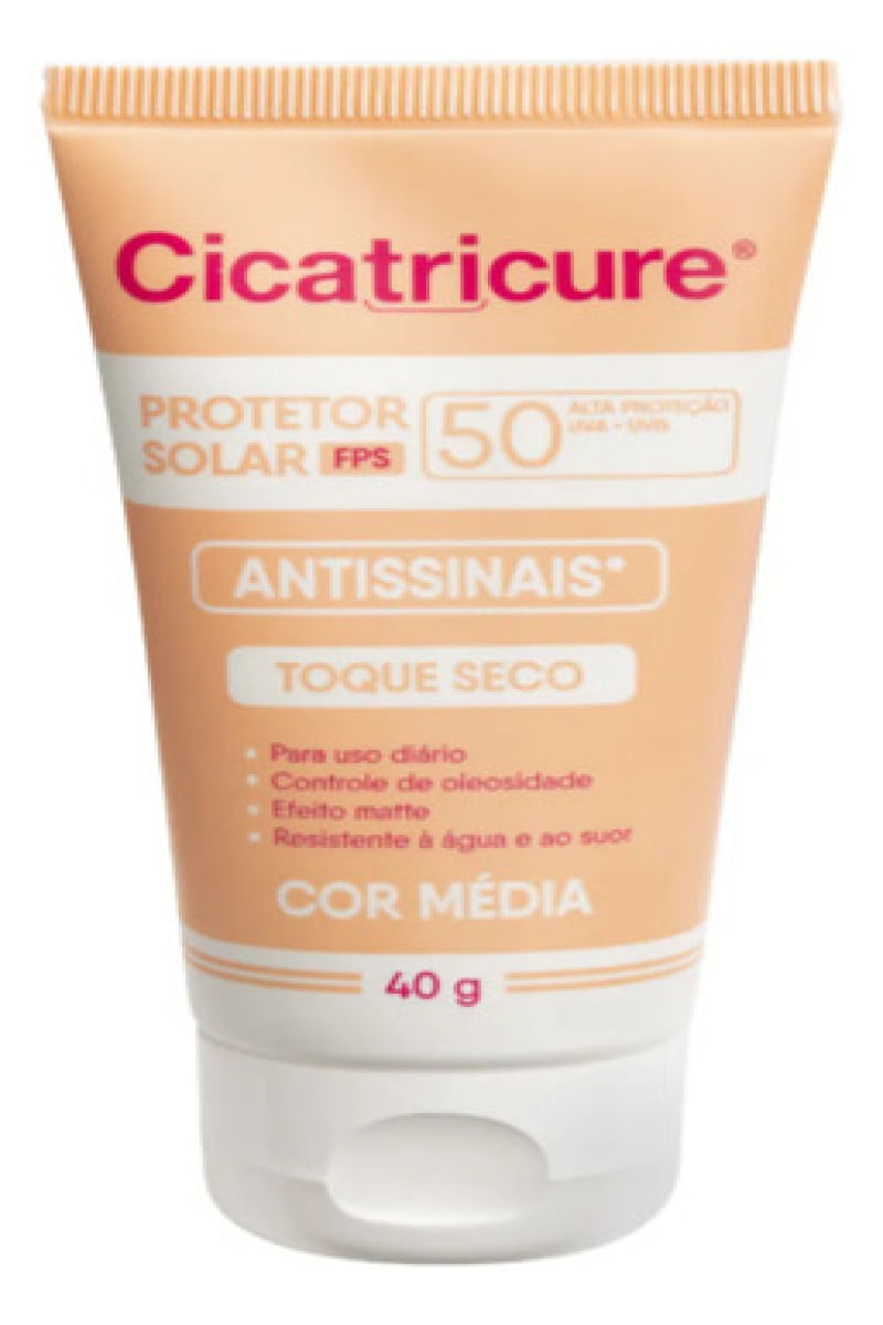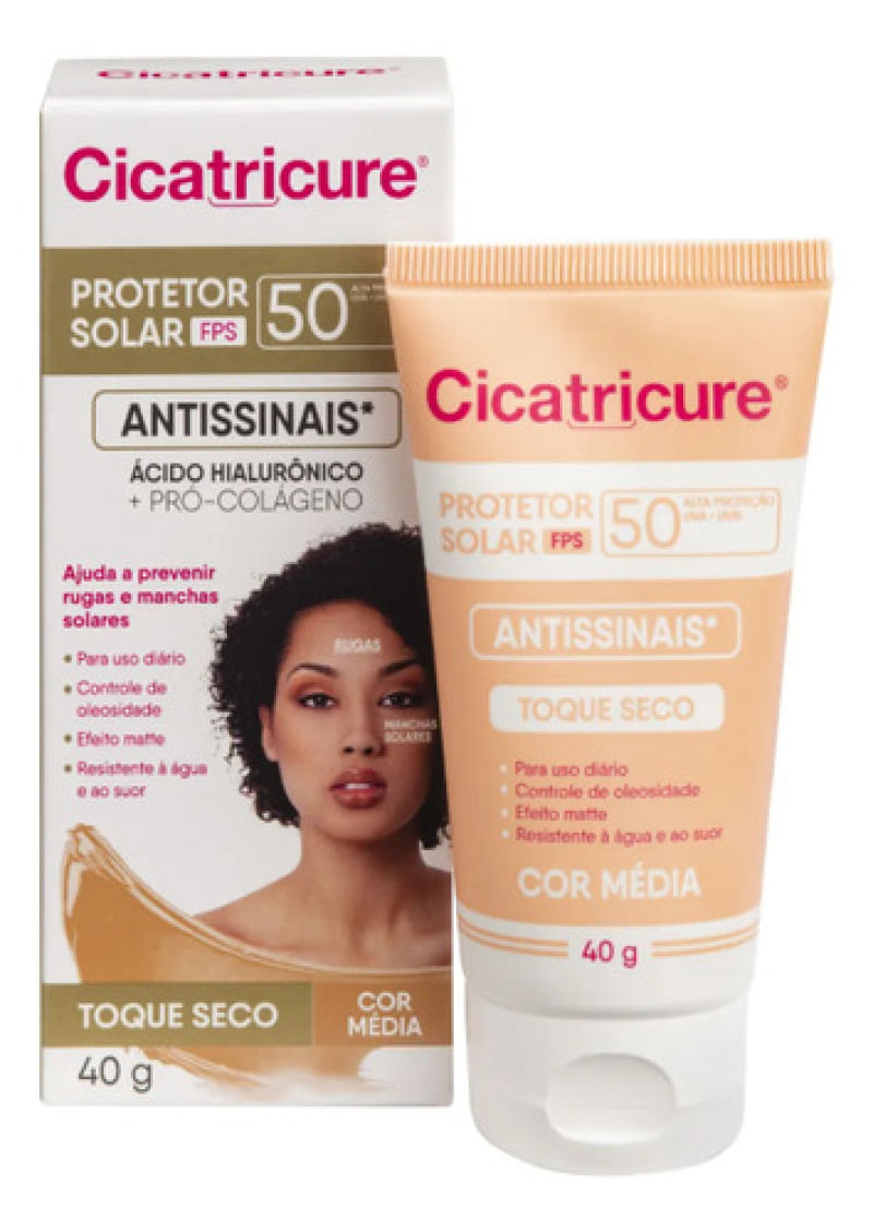 Cicatricure é um Protetor Solar Antissinais FPS 50 com cor Média, ideal para uso diário. Formulado com Ácido Hialurônico e Pró-colágeno, seu uso protege a pele do sol, ajudando a prevenir os sinais visíveis do fotoenvelhecimento como rugas, linhas de expressão e manchas solares. Além disso, controla a oleosidade do rosto, proporciona efeito mate e é resistente à água e ao suor. - Como usar o Protetor Solar Facial Antissinais Cicatricure FPS 50? Aplique o protetor solar sobre toda a pele, , no mínimo 30 minutos antes da exposição ao sol. Espalhe bem para cobrir o rosto. Recomendações Aplique abundantemente antes da exposição ao sol. Se a quantidade aplicada não for adequada, o nível de proteção será significativamente reduzido. Reaplicar sempre após sudorese intensa, nadar ou banhar-se, secar-se com toalha e durante a exposição ao sol. É necessária a reaplicação do produto para manter a sua efetividade. - Advertências Uso externo. Não ingerir. Este produto não oferece nenhuma proteção contra a insolação. Ajuda a prevenir as queimaduras solares. Evite exposição prolongada das crianças ao sol. Para crianças menores de 6 (seis) meses, consulte um médico. Em caso de contato direto com os olhos, enxague-os abundantemente. Havendo irritação, suspenda o uso e procure por orientação médica. Não insista no uso caso ocorra um efeito indesejado. Evite a exposição do produto à luz e ao calor excessivo. Mantenha a embalagem fechada. Mantenha fora do alcance de crianças. Aviso legal • Idade mínima recomendada: 10 anos.
