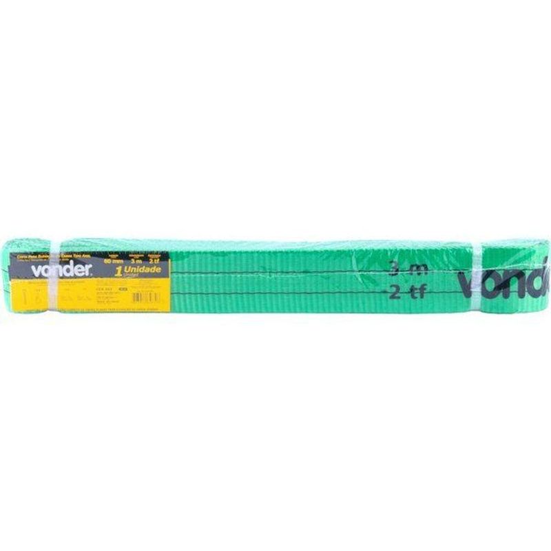 Cinta Elevação De Carga Vonder 7:1 3 Metros 2 ToneladasRef. Fornecedor: 8014302060Marca: VonderConteúdo Embalagem:1 Cinta para elevação de cargasAplicações e dicas de uso:Indicada para elevação e movimentação de cargas. Nunca utilizar para transporte e elevação de pessoas ou animais.Destaques e diferenciais:Possui excelente resistência, flexibilidade e facilidade no manuseio, reduzindo o esforço durante a operação, além de oferecer menor risco ou danos na movimentação de cargas. Cinta plana de elevação de carga tipo anel.Características Técnicas:Carga de trabalho da cinta em elevação vertical/direta: 2,0 tf Comprimento total da cinta elevação de carga: 3,0 m Fator de segurança da cinta de elevação de carga: 7:1 Largura da cinta: 60,0 mm Material da cinta: 100% Poliéster Norma de referência da cinta : ABNT NBR 15637-1 Produto: Cinta