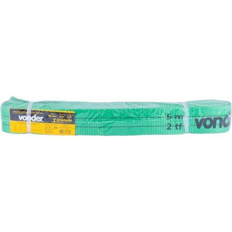 Cinta Elevação De Carga Vonder 7:1 5 Metros 2 Toneladas Ref. Fornecedor: 8014502060 Marca: VonderConteúdo Embalagem:1 Cinta para elevação de cargasAplicações e dicas de uso:Indicada para elevação e movimentação de cargas. Nunca utilizar para transporte e elevação de pessoas ou animais.Destaques e diferenciais:Possui excelente resistência, flexibilidade e facilidade no manuseio, reduzindo o esforço durante a operação, além de oferecer menor risco ou danos na movimentação de cargas. Cinta plana de elevação de carga tipo anel.Características Técnicas:Carga de trabalho da cinta em elevação vertical/direta: 2,0 tf Comprimento total da cinta elevação de carga: 5,0 mFator de segurança da cinta de elevação de carga: 7:1Largura da cinta: 60,0 mmMaterial da cinta: 100% PoliésterNorma de referência da cinta : ABNT NBR 15637-1Produto: Cinta