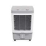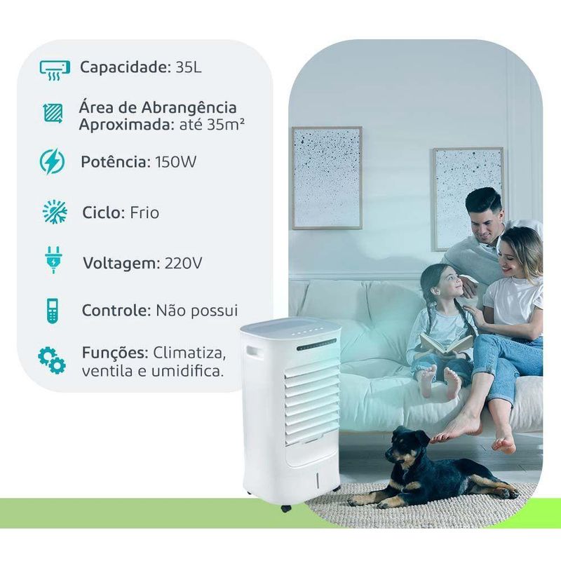 Climatizador Clin 35 Pro 35l 150w Ventisol 220v Branco Com Cinza 220vClimatizador CLIN 35 PRO 35L 150W VentisolO Climatizador Ventisol Clin 35 Pro 35L e a mais nova inovacao em climatizacao residencial, com design exclusivo e fabricacao nacional. Este modelo e ideal para proporcionar um ambiente ventilado e climatizado com total conforto para sua casa ou area comercial.Caracteristicas do Climatizador Clin 35 Pro 35L:Area de Abrangencia: Adequado para ambientes de 30 a 35 m², o modelo de 35 litros e eficaz em refrigerar espacos relativamente grandes, dependendo do numero de pessoas e das necessidades do ambiente.Dreno de Agua: Inclui um dreno que permite a vazao da agua no reservatorio, caso nao seja utilizada durante o funcionamento.Visor Frontal: Ajuda a monitorar o nivel de agua presente no reservatorio.Facilidade de Transporte: Equipado com quatro rodas, sendo duas frontais com travas, para facilitar o deslocamento.Beneficios Adicionais:Sistema Evaporativo Tipo Colmeia: Resfria e umidifica o ar, garantindo um ambiente mais agradavel.Triplo Reservatorio: Permite abastecimento pelas laterais ou pela tampa superior. Dica: Adicionar gelo pode proporcionar um resfriamento adicional ao ambiente.Painel de Controle Intuitivo:Climatizar: Aciona o sistema de irrigacao das colmeias.Ventilacao: Oferece tres velocidades sem oscilacao.Ventilacao + Oscilacao: Oferece tres velocidades com oscilacao.Protecao para Bomba: Desliga automaticamente a bomba em caso de falta de agua no reservatorio, garantindo maior durabilidade do aparelho.Dimensoes:Altura: 84,5 cmLargura: 35,5 cmProfundidade: 50 cmPeso: 9,8 KgGarantia do Fabricante: 12 meses