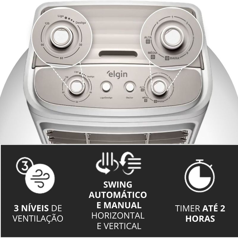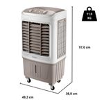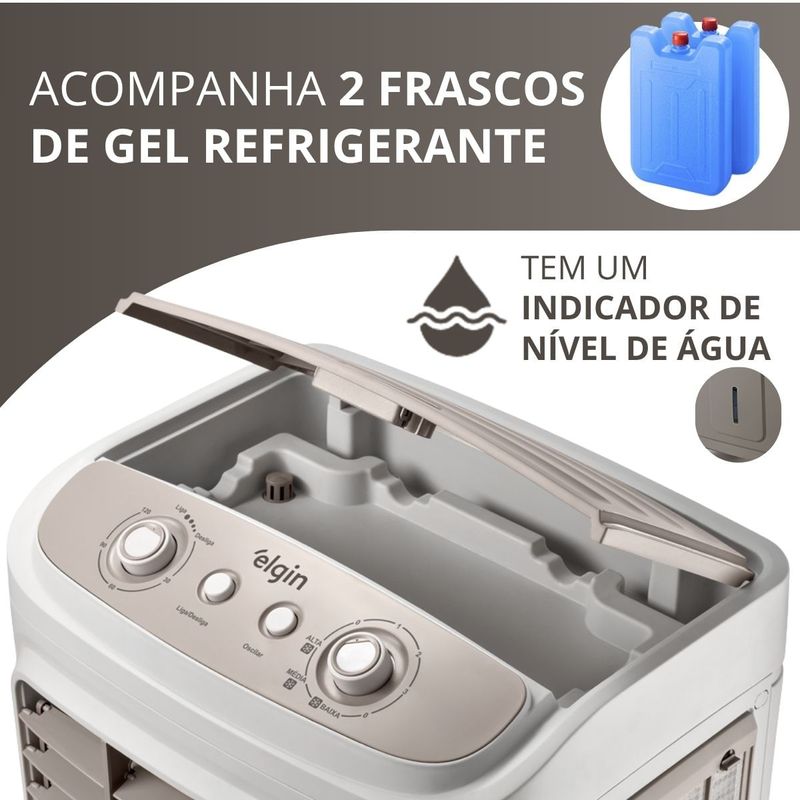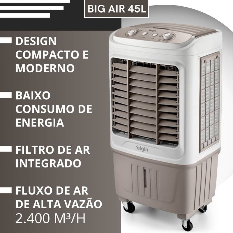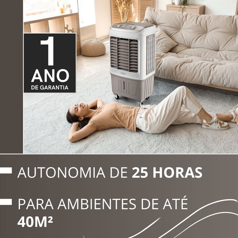 Conteúdo da embalagem:01 Climatizador04 Rodas de transporte02 Gel refrigerante01 Manual do produtoAtributos e benefícios:- Alta Vazão de Ar (2.400 m³/h): Ideal para ambientes amplos, proporcionando excelente circulação de ar em espaços de até 40m².- Eficiência Energética e Autonomia (25 horas): Possui grande autonomia, funcionando até 25 horas com uma única carga de água, proporcionando conforto por longos períodos sem necessidade de reposição constante.- Reservatório de 45 Litros: Capacidade ampla, minimizando a necessidade de reabastecimento frequente.- Umidificação e Resfriamento do Ar: Proporciona um ambiente mais fresco e saudável, sem a necessidade de manter portas ou janelas fechadas, garantindo a renovação do ar no ambiente.- Filtros de Nylon de Alta Qualidade: A filtragem eficiente ajuda a manter o ar limpo e saudável, melhorando a qualidade do ambiente.- Sistema de Desligamento Automático: Maior comodidade e segurança, desligando automaticamente após o período desejado, garantindo economia de energia.- Frascos de Gel Refrigerante Inclusos: Melhora o desempenho de resfriamento, ajudando a intensificar a sensação térmica de frescor.- Swing Automático e Manual (Horizontal e Vertical): Flexibilidade total para direcionar o fluxo de ar conforme sua necessidade.- Três Níveis de Intensidade da Névoa: Ajuste a intensidade do ar resfriado de acordo com sua preferência, garantindo maior controle e conforto.- Rodas Deslizantes com Trava: Facilita o transporte e manutenção do climatizador, com a segurança de travar as rodas para estabilidade durante o uso.- Puxador para Facilidade de Transporte: Permite movimentação rápida e fácil do climatizador entre os ambientes.- Certificação INMETRO e Garantia de 1 Ano: Produto com selo de qualidade e segurança, garantindo durabilidade e desempenho confiável.- Ideal para Ambientes Amplos: Com alta vazão e grande alcance, proporciona ventilação e conforto térmico em ambientes maiores, como salas de estar, escritórios e até áreas externas cobertas.Especificações técnicas:- Potência: 103W- Reservatório de água: 45 litros- Autonomia: 25 horas- 3 níveis de ventilação- Compartimento para Gelo- Design compacto e moderno- 4 Rodas deslizantes com trava- Timer até 2 horas- Compartimento para Gelo: Sim- Painel Eletrônico: Não- Indicação de Nível: Sim- Air Swing: Sim- Vazão de Ar: 2400 m3/hDimensões e Peso:- Dimensões na caixa: (L x A x C): 54,5 x 94,0 x 43,0 cm- Dimensões do produto: (L x A x C): 49,2 x 97,0 x 38,0 cm- Peso: 11.0 kg- Peso Bruto: 13.2 kgGarantia:- 1 Ano de Garantia do fabricante