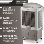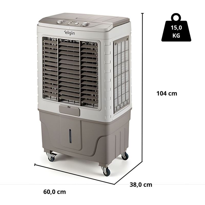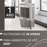 Conteúdo da embalagem:01 Climatizador.04 Rodas de transporte02 Gel refrigerante01 Manual do produtoAtributos e benefícios:- Alta Vazão de Ar (3500 m3/h): Ideal para ambientes amplos, proporcionando excelente circulação de ar em espaços de até 60m².- Eficiência Energética e Autonomia (30 horas): Possui grande autonomia, funcionando até 25 horas com uma única carga de água, proporcionando conforto por longos períodos sem necessidade de reposição constante.- Reservatório de 65 Litros: Super capacidade, minimizando a necessidade de reabastecimento frequente.- Umidificação e Resfriamento do Ar: Proporciona um ambiente mais fresco e saudável, sem a necessidade de manter portas ou janelas fechadas, garantindo a renovação do ar no ambiente.- Filtros de Nylon de Alta Qualidade: A filtragem eficiente ajuda a manter o ar limpo e saudável, melhorando a qualidade do ambiente.- Sistema de Desligamento Automático: Maior comodidade e segurança, desligando automaticamente após o período desejado, garantindo economia de energia.- Frascos de Gel Refrigerante Inclusos: Melhora o desempenho de resfriamento, ajudando a intensificar a sensação térmica de frescor.- Swing Automático e Manual (Horizontal e Vertical): Flexibilidade total para direcionar o fluxo de ar conforme sua necessidade.- Três Níveis de Intensidade da Névoa: Ajuste a intensidade do ar resfriado de acordo com sua preferência, garantindo maior controle e conforto.- Rodas Deslizantes com Trava: Facilita o transporte e manutenção do climatizador, com a segurança de travar as rodas para estabilidade durante o uso.- Puxador para Facilidade de Transporte: Permite movimentação rápida e fácil do climatizador entre os ambientes.- Certificação INMETRO e Garantia de 1 Ano: Produto com selo de qualidade e segurança, garantindo durabilidade e desempenho confiável.- Ideal para Ambientes Amplos: Com alta vazão e grande alcance, proporciona ventilação e conforto térmico em ambientes maiores, como salas de estar, escritórios e até áreas externas cobertas.Especificações técnicas:- Reservatório de água: 65 litros- Potência: 177W- Autonomia: 30 horas- 3 níveis de ventilação- Compartimento para Gelo- Design compacto e moderno- 4 Rodas deslizantes com trava- Timer até 2 horas- Compartimento para Gelo: Sim- Painel Eletrônico: Não- Indicação de Nível: Sim- Air Swing: Sim- Vazão de Ar: 3500 m3/hDimensões e Peso:- Dimensões na caixa: (L x A x C): 64,5 x 102 x 44,0 cm- Dimensões do produto: (L x A x C): 60,0 x 104 x 38,0 cm- Peso: 15.0 kg- Peso Bruto: 17.5 kgGarantia:- 1 Ano de Garantia do fabricante