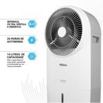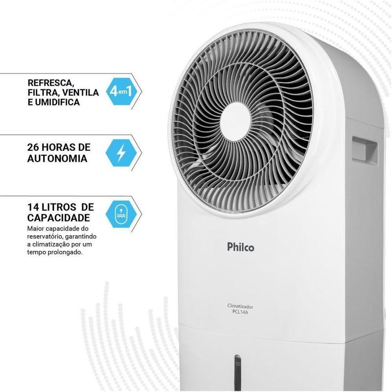 Climatizador De Ar Philco 14L 4 Em 1 90W PCL14A 110VO Climatizador de Ar Philco 14L 4 em 1 90W PCL14A oferece maior autonomia com um reservatório de 14 litros, permitindo climatização contínua por até 26 horas sem reabastecimento.Com funções 4 em 1, ele resfria, umidifica, filtra e ventila, garantindo versatilidade e conforto em qualquer estação do ano. Seu modelo de turbina exclusivo, com design inovador, proporciona eficiência superior na circulação do ar.São 3 velocidades de ventilação para ajustar o nível ideal de climatização conforme a necessidade, além do filtro colmeia que retém poeira e partículas, melhorando a dispersão da água e deixando o ambiente mais limpo e agradável. O controle remoto incluso permite acionar e configurar o climatizador à distância com praticidade.Com potência de 90W, esse Climatizador de Ar Philco oferece climatização rápida e eficiente com baixo consumo de energia elétrica, e ainda conta com rodinhas integradas para facilitar o transporte entre diferentes ambientes da casa ou escritório.26h de autonomiaFunções 4 em 1: Resfriar, Umidificar, Filtrar e Ventilar3 velocidades de ventilaçãoReservatório de 14LFiltro ColmeiaControle remoto inclusoPotência de 90WRodinhas integradasObservação: Somente faturamos para o nosso consumidor final, ou seja, não faturamos pedidos para CNPJ por este portal de vendas.Especificações TécnicasMarca: PhilcoModelo: PCL14ACor: BrancoCiclo: FrioTipo de alimentação: Energia ElétricaEstado: NovoGarantia (Dias): 360