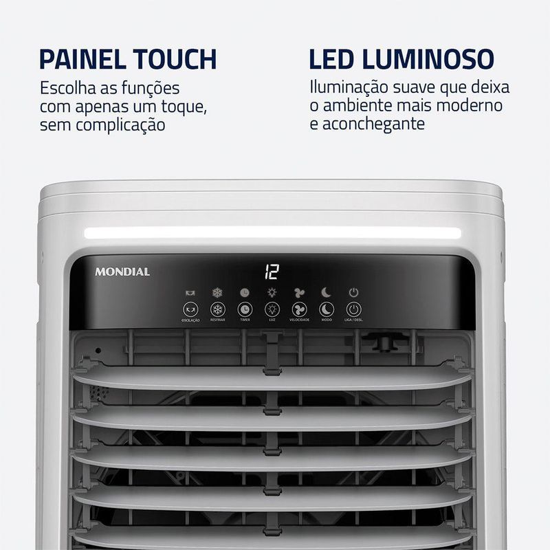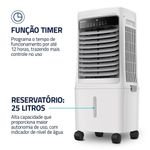 Climatizador Mondial Turbo 25 Litros150W CL-25L Branco Com Cinza 220VMantenha sua casa sempre fresca com o Climatizador Mondial Turbo. Com reservatório de 25 litros e indicador do nível de água, oferece ótima autonomia para longos períodos de uso e mais praticidade no reabastecimento. O climatizador Mondial reúne cinco funções em um só aparelho: filtra, ventila, circula, umidifica e climatiza o ar, promovendo bem-estar em qualquer espaço.O sistema de oscilação vertical, que é automática, e horizontal, acionado manualmente, distribui o ar de forma mais uniforme. Com três velocidades, além do modo noturno e das funções resfriar e oscilar, você ajusta o fluxo conforme sua preferência - de uma brisa leve a um resfriamento mais intenso.5 em 1: O climatizador Mondial filtra, ventila, circula, umidifica e climatiza o ar, melhorando a qualidade do ar no seu dia a dia.Reservatório Superior: Permite adicionar água e gelo de forma simples e rápida para turbinar a climatização nos dias mais quentes. Acompanha 2 recipientes com gel para um resfriamento ainda mais eficiente.Controle Remoto: Ajuste todas as funções do climatizador à distância, com total comodidade.Capacidade do Reservatório: Com 25 litros e indicador do nível de água, oferece ótima autonomia para longos períodos de uso e mais praticidade no reabastecimento.Função Timer: Permite programar o tempo de funcionamento por até 12 horas, trazendo mais praticidade e controle no uso diário.Controle de Velocidade: Possui 3 níveis, além do modo noturno e das funções resfriar e oscilar. Ajuste o fluxo de ar de acordo com a sua necessidade.Potência de 150W: Eficiência na medida certa para refrescar o ambiente, combinando bom desempenho com economia no dia a dia.Painel Touch: Controle simples e direto. Escolha as funções com apenas um toque, sem complicação.Led Luminoso: Iluminação suave que transforma o ambiente, trazendo um toque moderno e aconchegante.Função Oscilar: Distribui o ar de forma uniforme e eficiente por toda a área, combinando oscilação vertical, que é automática, com a horizontal, acionada manualmente.Design Portátil e Funcional: Com rodas com trava, o climatizador pode ser transportado com facilidade entre os ambientes. Conta ainda com dreno, que auxilia na vazão da água do reservatório, tornando a limpeza e manutenção muito mais práticas.Mondial, a escolha inteligente!Especificações Técnicas:Modelo: CL-25LCor: BrancoVoltagem (Tensão): 220VPotência: 150WCapacidade do reservatório: 25 LitrosConsumo de energia: 1,5WReservatório de gelo para resfriamento da água: SIMFunção umidificar: SIMFunção oscilar: SIMTimer programável: SIMTipo do filtro: -Controle remoto: SIMOscilante: SIMItens inclusos: 01 Climatizador; 01 Controle Remoto; 02 Recipientes com Gel e 01 Manual de Instruções.Dimensões e Peso Aproximados do Produto:Altura:83 cmLargura:39,5 cmProfundidade:30,5 cmPeso:6,5KgGarantia Produto: 1 Ano (3 meses de garantia legal e 9 meses para de fabricação).Importante: Imprescindível à conferência no ato da . Em caso de anormalidade, recuse o .Todas as informações divulgadas são de responsabilidade do fabricante, podendo sofrer alterações sem nenhum aviso prévio.Imagem meramente ilustrativa.Climatizador Mondial Turbo 25L 150W CL-25L Branco com Cinza 220V