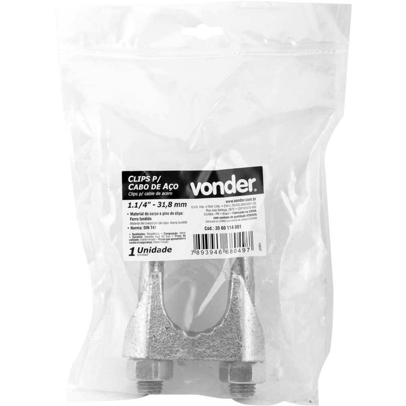 Clips Para Cabo de aço 1.1/4" - 31,80 mm, Pacote com 1 Peça, Vonder OstenVonder - Conteúdo da embalagem: 1 Clips para cabo de aço. Aplicação: Indicado para prensar/amarrar cabos de aço. A medida dos clips/grampos deve ser compatÃvel com o diâmetro do cabo, recomendado para aplicações leves. Não deve ser usado em aplicações de elevação de cargas. Destaques: Possui tratamento galvanizado, proporcionando resistência à oxidação/corrosão. Garantia - E (CDC): Garantia legal: 90 dias Referência: 3560114001 Capacidade do clips: 1.1/4" - 31,80 mm Largura total do clips (F): 80,0 mm Material do corpo: Ferro fundido Material do pino: Ferro fundido Espessura total do clips (B): 39,0 mm Diâmetro da rosca do clips (D): 16,0 mm Altura do clips (G): 105,0 mm Comprimento da rosca do clips (C): 55,0 mm Norma de referência do clips: DIN 741 Acabamento: Galvanizado Massa aproximada (peso): 0,014 kg Destaques Comercial: Possui tratamento galvanizado, proporcionando resistência à oxidação/corrosão. Aplicação Comercial: Usado para prensar ou amarrar cabos de aço leves, com clips compatÃveis ao diâmetro. Não indicado para elevação de cargas. Características Gerais do Produto: Garantia: • 3 Meses