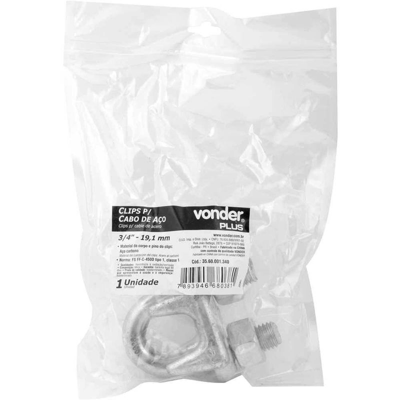 Clips Para Cabo De Aço 3/4 - 19,10 Mm, Pesado, Encartelado, Vonder PlusClips Para Cabo de aço 3/4 - 19,10 mm, Pesado, Encartelado, Vonder Plus -Conteúdo da embalagem: 1 Clips para cabo de aço.Aplicação: Indicado para prensar/amarrar cabos de aço. A medida dos clips/grampos deve ser compatível com o diâmetro do cabo. Uso industrial.Destaques: Material fabricado e testado conforme a norma FS FF-C-450D tipo 1, classe 1, com corpo galvanizado a fogo, proporcionando melhor resistência à oxidação/corrosão.Garantia - E (CDC): Garantia legal: 90 diasReferência: 3560001340Capacidade do clips: 3/4 - 19,10 mmMaterial do corpo: Aço carbonoMaterial do pino: Aço carbonoNorma de referência do clips: FS FF-C-450D tipo 1, classe 1Medida A: 38,0 mmMedida B: 57,0 mmMedida C: 37,0 mmMedida D: 16,0 mmMedida E: 35,0 mmMedida F: 72,0 mmMedida G: 70,0 mmAcabamento: Galvanizado a fogoDestaques Comercial: Material conforme norma FS FF-C-450D tipo 1, classe 1, com corpo galvanizado a fogo contra corrosão.Aplicação Comercial: Usado para prensar ou amarrar cabos de aço; medida deve ser compatível com o diâmetro do cabo. Uso industrial.Características Gerais do Produto:Garantia: - 3 Meses