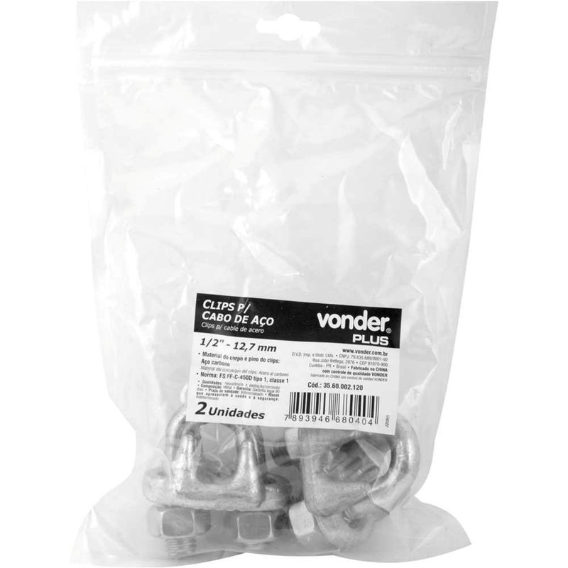 Marca: VonderConteúdo da embalagem:2 Clips para cabo de aço.Destaques e diferenciais:Material fabricado e testado conforme a norma FS FF-C-450D tipo 1, classe 1, com corpo galvanizado a fogo, proporcionando melhor resistência à oxidação/corrosão.Aplicações e dicas de uso:Indicado para prensar/amarrar cabos de aço. A medida dos clips/grampos deve ser compatível com o diâmetro do cabo. Uso industrial.Detalhes TécnicosCapacidade do clips: 1/2" - 12,70 mm Acabamento: Galvanizado Material do corpo: Aço carbono Material do pino: Aço carbono Distância entre roscas do clips (A): 32,0 mm Espessura total do clips (B): 49,0 mm Comprimento da rosca do clips (C): 25,0 mm Diâmetro da rosca do clips (D): 13,0 mm Altura do suporte do clips (E): 29,0 mm Largura total do clips (F): 58,0 mm Altura do clips (G): 49,0 mm Norma de referência do clips: FS FF-C-450D tipo 1, classe 1 Garantia - E (CDC):Garantia legal: 90 dias