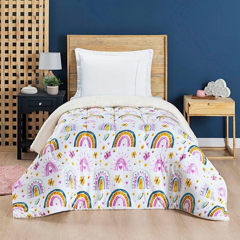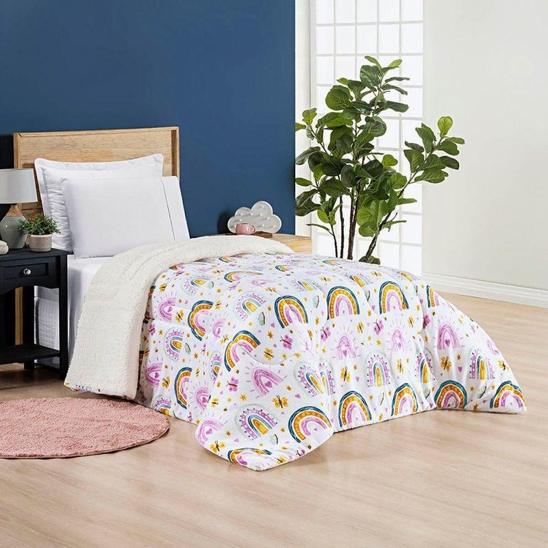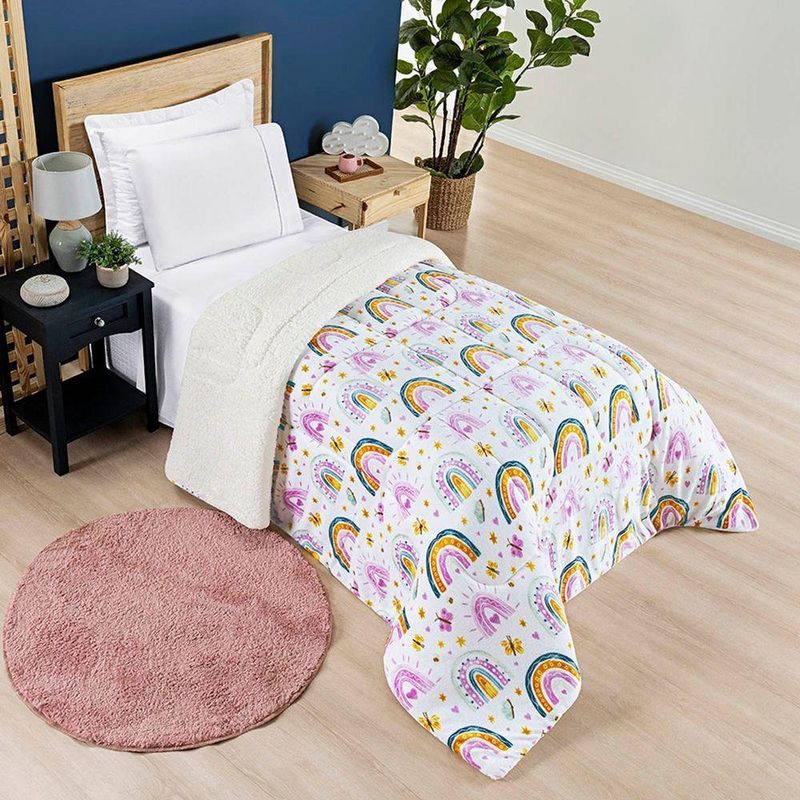 Coberdrom Cobertor Lutti Solteiro Quarto Cama Infantiil Sherpa Manta Toque Lã De Carneiro Rainbow Arcos íris RosaCoberdrom Solteiro Lutti Kids: Maciez que abraça, magia que aquece.Transforme o quarto das crianças em um espaço cheio de cor, imaginação e aconchego. O Coberdrom Lutti Kids foi criado para trazer alegria ao ambiente, com estampas exclusivas que encantam e dão vida ao quarto infantil.O Coberdrom Lutti Kids é dupla face e oferece dois tipos de aconchego em uma única peça. De um lado, a manta flannel proporciona toque macio e quentinho. Do outro, a sherpa fofinha envolve como um abraço, perfeita para os dias mais frios. Juntas, essas texturas criam uma combinação irresistível de conforto, leveza e bem-estar.Cada detalhe foi pensado para unir praticidade e beleza no dia a dia. O Coberdrom Lutti Kids tem acabamento caprichado, caimento confortável e gramatura ideal para manter o calor sem perder suavidade, tornando as noites mais aconchegantes e acolhedoras.Contêm na embalagem:01 Coberdrom Solteiro: 2,40m x 1,50mComposição:Manta Microfibra Flannel: 100% PoliésterTecido Sherpa: 100% PoliésterEnchimento: 100% PoliésterGramatura da Manta (Enchimento): 150 g/m²Características do Produto:- Dupla face com flannel macia e sherpa fofinha.- Toque ultramacio e sensação aconchegante.- Acabamento reforçado e caimento confortável.Benefícios:- Deixa o quarto infantil mais colorido, divertido e acolhedor.- Garante conforto e aquecimento em noites mais frias.- Permite variar o visual da cama com facilidade.- Perfeito para acompanhar o ritmo e a imaginação das crianças.Atenção: As cores do produto podem sofrer pequenas variações devido à configuração da tela do seu dispositivo.
