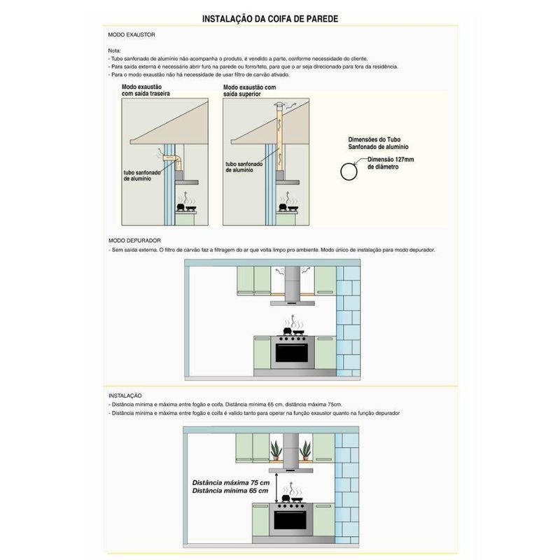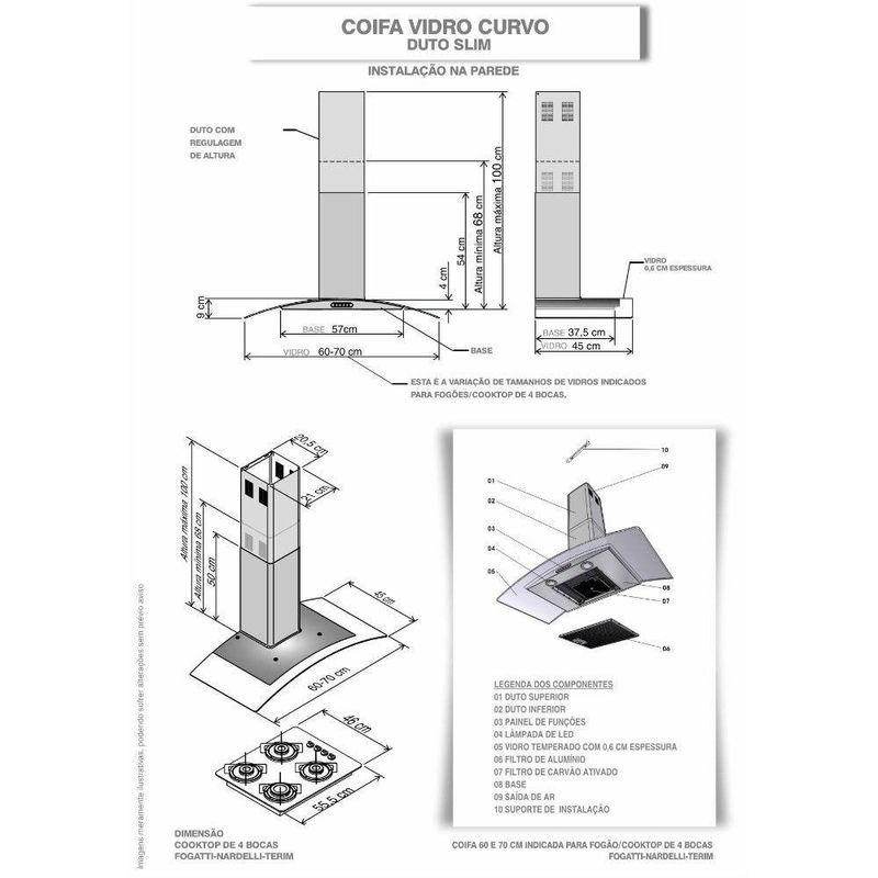 Coifa De Parede 60cm Vidro Curvo Duto Slim Fogatti Preto 220vDeixe sua cozinha mais moderna com a Coifa de parede Vidro Curvo da Fogatti. Além de prática e bonita, possui a base e duto em preto e acompanha filtro de alumínio e filtro de carvão ativado. A coifa pode ser instalada de dois modos distintos, como exaustor ou como depurador. Com design diferenciado, possui vidro curvo e temperado, que facilita sua limpeza, iluminação com lâmpadas de led e três velocidades. Traga mais versatilidade para sua cozinha.Para Fogão cooktop de 4 bocas é indicado coifa de 60 ou 70 cm.Para Fogão cooktop de 5 bocas é indicado coifa de 75, 80 ou 90 cm.Para Fogão cooktop de 6 bocas é indicado coifa de 90 cm ou mais.Observação importante, sempre observar a largura do seu fogão, para que a largura da coifa seja sempre um pouco maior que o fogão cooktop.Instalação apenas na ParedeObservação, este modelo não aceita instalação no teto. Caso precise de coifa para instalar no teto, basta pesquisar por Coifa de ilha, e colocar a marca desejadaAtenção verifique a tensão escolhida antes de finalizar sua compraCaracterísticasFunção depurador ou exaustorFiltro interno de carvão ativadoFiltro externo metálico em alumínio e lavávelPainel de funções Easy Touch com 3 velocidadesIluminação com lâmpadas de LedSucção 550 m³hSuporte de fixação acompanha a coifaDuto dividido em superior e inferior com regulagem de altura. mín 68 cm e máx 100 cm já considerando a altura da base da coifaDuto superior possui abertura para ventilação, quando usado no modo depuradorEspecificações TécnicasTensão 127V ou 220V, a tensão deve ser escolhida e selecionada no ato da compraFrequência 60 HzRuído 65 dBPotência do motor 140 WPotência total 142 WVelocidades 3Potência lâmpada 1 W cada umaConsumo 0,142 kWhDimensõesAltura total de 100 cm, com regulagem entre 68 cm e 100 cm, já considerando a base da coifaLargura vidro 60 cm, vidro ponta a pontaProfundidade vidro 45 cmAltura base 4 cmLargura base 57 cmProfundidade base 37,5 cmPeso 10,35 kgDimensões do duto L 21 cm x P 20,5 cm. São dois dutos em aço carbono pintado de 50 cm de altura cada umGarantia de Fábrica 12 mesesInstalação por conta do clienteImagens meramente ilustrativasAtenção, o tubo sanfonado para exaustão, NÃO acompanha o produto, Vendemos o tubo separadamente. O diâmetro de saída para o mesmo é de 127 mm de circunferênciaAs dimensões do produto podem sofrer uma pequena variação de largura do vidro, de até 7 sete milímetros. Por este motivo, quando a coifa for instalada de forma embutida em nichos, o fabricante recomenda que seja considerada uma folga de pelo menos 1 cm em cada ladoPara cozinhas com pé direito superior a 2,65 m, temos disponível para venda à parte, um modelo de duto complementar em aço inox escovado.Sua coifa já vai pronta para utilizar como depurador pois já possui internamente filtro de carvão ativado. Caso deseje utilizar como exaustor com saída de ar externa, onde será necessário fazer uma abertura na parede, apenas precisará comprar e instalar o tubo sanfonado de alumínio flexível que temos disponível para venda.Cor: Preto Voltagem: 220V