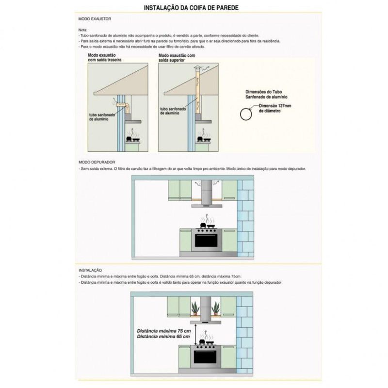 Coifa De Parede 70cm Vidro Curvo Duto Slim Nardelli Inox 220vDeixe sua cozinha mais moderna com a Coifa de parede Vidro Curvo da Nardelli. Além de prática e bonita, possui a base e duto em inox e acompanha filtro de alumínio e filtro de carvão ativado. A coifa pode ser instalada de dois modos distintos, como exaustor ou como depurador. Com design diferenciado, possui vidro curvo e temperado, que facilita sua limpeza, iluminação com lâmpadas de led e três velocidades. Traga mais versatilidade para sua cozinha. Para Fogão cooktop de 4 bocas é indicado coifa de 60 ou 70 cm. Para Fogão cooktop de 5 bocas é indicado coifa de 75, 80 ou 90 cm. Para Fogão cooktop de 6 bocas é indicado coifa de 90 cm ou mais. Observação importante, sempre observar a largura do seu fogão, para que a largura da coifa seja sempre um pouco maior que o fogão cooktop. Instalação apenas na Parede Observação, este MODEL não aceita instalação no teto. Caso precise de coifa para instalar no teto, basta r por Coifa de ilha, e colocar a marca desejada Atenção verifique a voltagem escolhida antes de finalizar sua compra Características: Marca: Nardelli MODEL: Duto Slim Função depurador ou exaustor Filtro interno de carvão ativado Filtro externo metálico em alumínio e lavável Painel de funções Easy Touch com 3 velocidades Iluminação com lâmpadas de Led Sucção 550 m³h Suporte de fixação acompanha a coifa Duto dividido em superior e inferior com regulagem de altura. mín 68 cm e máx 100 cm já considerando a altura da base da coifa Duto superior possui abertura para ventilação, quando no modo depurador Especificações Técnicas: Frequência 60 Hz Ruído 65 dB Potência do motor 140 W Potência total 142 W Velocidades 3 Potência lâmpada 1 W cada uma Consumo 0,142 kWh Dimensões: Altura total de 100 cm, com regulagem entre 68 cm e 100 cm, já considerando a base da coifa Largura vidro 70 cm, vidro ponta a ponta Profundidade vidro 45 cm Altura base 5 cm Largura base 57 cm Profundidade base 37,5 cm Peso 10,85 kg Dimensões do duto L 21 cm x P 20,5 cm. São dois dutos em aço inox de 50 cm de altura cada um Garantia de Fábrica 12 meses Observações: Tensão 127V ou 220V, a voltagem deve ser escolhida e selecionada no ato da compra Instalação por conta do cliente Imagens meramente ilustrativas Atenção, o tubo sanfonado para exaustão, NÃO acompanha o produto, Vendemos o tubo separadamente. O diâmetro de saída para o mesmo é de 127 mm de circunferência As dimensões do produto podem sofrer uma pequena variação de largura do vidro, de até 7 sete milímetros. Por este motivo, quando a coifa for instalada de forma embutida em nichos, o MANUFACTURER recomenda que seja considerada uma folga de pelo menos 1 cm em cada lado Para cozinhas com pé direito superior a 2,65 m, temos disponível para venda à parte, um MODEL de duto complementar em aço inox escovado. Sua coifa já vai pronta para utilizar como depurador pois já possui internamente filtro de carvão ativado. Caso deseje utilizar como exaustor com saída de ar externa, onde será necessário fazer uma abertura na parede, apenas precisará comprar e instalar o tubo sanfonado de alumínio flexível que temos disponível para venda.COLOR: Inox Voltagem: 220V