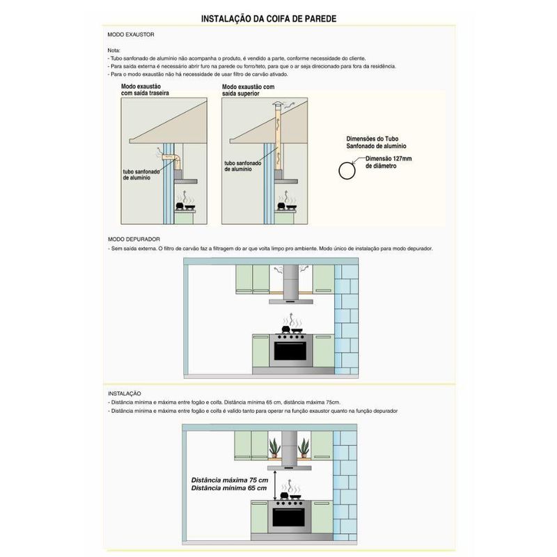 Coifa De Parede 70cm Vidro Curvo Duto Slim Fogatti Black 220VDeixe sua cozinha mais moderna com a Coifa de parede Vidro Curvo da Fogatti. Alem de pratica e bonita, possui a base e duto em preto e acompanha filtro de aluminio e filtro de carvao ativado. A coifa pode ser instalada de dois modos distintos, como exaustor ou como depurador. Com design diferenciado, possui vidro curvo e temperado, que facilita sua limpeza, iluminacao com lampadas de led e tres velocidades. Traga mais versatilidade para sua cozinha.Para Fogao cooktop de 4 bocas e indicado coifa de 60ou 70cm. Para Fogao cooktop de 5 bocas e indicado coifa de 75, 80ou 90cm. Para Fogao cooktop de 6 bocas e indicado coifa de 90cm ou mais. Observacao importante, sempre observar a largura do seu fogao, para que a largura da coifa seja sempre um pouco maior que o fogao cooktop. Instalacao apenas na Parede Observacao, este modelo nao aceita instalacao no teto. Caso precise de coifa para instalar no teto, basta pesquisar por Coifa de ilha, e colocar a marca desejada Atencao verifique a voltagem escolhida antes de finalizar sua compra Caracteristicas Funcao depurador ou exaustor Filtro interno de carvao ativado Filtro externo metalico em aluminio e lavavel Painel de funcoes Easy Touch com 3 velocidades Iluminacao com lampadas de Led Succao 550m³h Suporte de fixacao acompanha a coifa Duto dividido em superior e inferior com regulagem de altura. min 68cm e max 100cm ja considerando a altura da base da coifa Duto superior possui abertura para ventilacao, quando usado no modo depuradorEspecificacoes TecnicasFrequencia 60Hz Ruido 65 dB Potencia do motor 140W Potencia total 142 W Velocidades 3 Potencia lampada 1 W cada uma Consumo 0,142 kWh Dimensoes Altura total de 100cm, com regulagem entre 68cm e 100cm, ja considerando a base da coifa Largura vidro 70cm, vidro ponta a ponta Profundidade vidro 45cm Altura base 4cm Largura base 57cm Profundidade base 37,5cm Peso 10,85 kg Dimensoes do duto L 21cm x P 20,5cm. Sao dois dutos em aco carbono pintado de 50cm de altura cada um Garantia de Fabrica 12 meses Instalacao por conta do cliente Imagens meramente ilustrativas Atencao, o tubo sanfonado para exaustao, NAO acompanha o produto, Vendemos o tubo separadamente. O diametro de saida para o mesmo e de 127 mm de circunferencia As dimensoes do produto podem sofrer uma pequena variacao de largura do vidro, de ate 7 sete milimetros. Por este motivo, quando a coifa for instalada de forma embutida em nichos, o fabricante recomenda que seja considerada uma folga de pelo menos 1cm em cada lado Para cozinhas com pe direito superior a 2,65 m, temos disponivel para venda a parte, um modelo de duto complementar em aco inox escovado. Sua coifa ja vai pronta para utilizar como depurador pois ja possui internamente filtro de carvao ativado. Caso deseje utilizar como exaustor com saida de ar externa, onde sera necessario fazer uma abertura na parede, apenas precisara comprar e instalar o tubo sanfonado de aluminio flexivel que temos disponivel para venda.