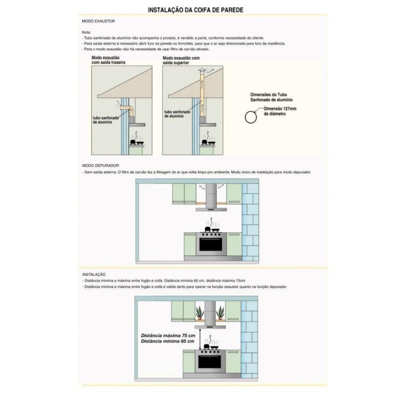 Coifa De Parede 75cm Vidro Curvo Slim Nardelli Red 220VDeixe sua cozinha mais moderna com a Coifa de parede Vidro Curvo da Nardelli. Alem de pratica e bonita, possui a base e duto em vermelho e acompanha filtro de aluminio e filtro de carvao ativado. A coifa pode ser instalada de dois modos distintos, como exaustor ou como depurador. Com design diferenciado, possui vidro curvo e temperado, que facilita sua limpeza, iluminacao com lampadas de led e tres velocidades. Traga mais versatilidade para sua cozinha.Para Fogao cooktop de 4 bocas e indicado coifa de 60 ou 70 cm. Para Fogao cooktop de 5 bocas e indicado coifa de 75, 80 ou 90 cm. Para Fogao cooktop de 6 bocas e indicado coifa de 90 cm ou mais. Observacao importante, sempre observar a largura do seu fogao, para que a largura da coifa seja sempre um pouco maior que o fogao cooktop. Instalacao apenas na Parede Observacao, este modelo nao aceita instalacao no teto. Caso precise de coifa para instalar no teto, basta pesquisar por Coifa de ilha, e colocar a marca desejada Atencao verifique a voltagem escolhida antes de finalizar sua compra Caracteristicas Funcao depurador ou exaustor Filtro interno de carvao ativado Filtro externo metalico em aluminio e lavavel Painel de funcoes Easy Touch com 3 velocidades Iluminacao com lampadas de Led Succao 550 m³h Suporte de fixacao acompanha a coifa Duto dividido em superior e inferior com regulagem de altura. min 68 cm e max 100 cm ja considerando a altura da base da coifa Duto superior possui abertura para ventilacao, quando no modo depurador Especificacoes TecnicasPotencia lampada 1 W cada uma Consumo 0,142 kWh Dimensoes Altura total de 100 cm, com regulagem entre 68 cm e 100 cm, ja considerando a base da coifa Largura vidro 75 cm, vidro ponta a ponta Profundidade vidro 45 cm Altura base 5 cm Largura base 57 cm Profundidade base 37,5 cm Peso 11,15 kg Dimensoes do duto L 21 cm x P 20,5 cm. Sao dois dutos em aco carbono pintado de 50 cm de altura cada um Garantia de Fabrica 12 meses Instalacao por conta do cliente Imagens meramente ilustrativas Atencao, o tubo sanfonado para exaustao, NAO acompanha o produto, Vendemos o tubo separadamente. O diametro de saida para o mesmo e de 127 mm de circunferencia As dimensoes do produto podem sofrer uma pequena variacao de largura do vidro, de ate 7 sete milimetros. Por este motivo, quando a coifa for instalada de forma embutida em nichos, o fabricante recomenda que seja considerada uma folga de pelo menos 1 cm em cada lado Para cozinhas com pe direito superior a 2,65 m, temos disponivel para venda a parte, um modelo de duto complementar em aco inox escovado. Sua coifa ja vai pronta para utilizar como depurador pois ja possui internamente filtro de carvao ativado. Caso deseje utilizar como exaustor com saida de ar externa, onde sera necessario fazer uma abertura na parede, apenas precisara comprar e instalar o tubo sanfonado de aluminio flexivel que temos disponivel para venda.