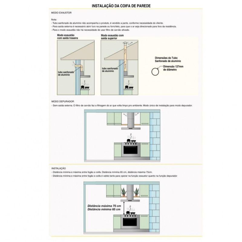 Coifa De Parede 80cm Vidro Curvo Duto Slim Nardelli Inox 220VDeixe sua cozinha mais moderna com a Coifa de parede Vidro Curvo da Nardelli. Alem de pratica e bonita, possui a base e duto em inox e acompanha filtro de aluminio e filtro de carvao ativado. A coifa pode ser instalada de dois modos distintos, como exaustor ou como depurador. Com design diferenciado, possui vidro curvo e temperado, que facilita sua limpeza, iluminacao com lampadas de led e tres velocidades. Traga mais versatilidade para sua cozinha.Para Fogao cooktop de 4 bocas e indicado coifa de 60 ou 70 cm.Para Fogao cooktop de 5 bocas e indicado coifa de 75, 80 ou 90 cm.Para Fogao cooktop de 6 bocas e indicado coifa de 90 cm ou mais.Observacao importante, sempre observar a largura do seu fogao, para que a largura da coifa seja sempre um pouco maior que o fogao cooktop.Instalacao apenas na ParedeObservacao, este modelo nao aceita instalacao no teto. Caso precise de coifa para instalar no teto, basta pesquisar por Coifa de ilha, e colocar a marca desejadaAtencao verifique a voltagem escolhida antes de finalizar sua compraCaracteristicasFuncao depurador ou exaustorFiltro interno de carvao ativadoFiltro externo metalico em aluminio e lavavelPainel de funcoes Easy Touch com 3 velocidadesIluminacao com lampadas de LedSuccao 550 m³hSuporte de fixacao acompanha a coifaDuto dividido em superior e inferior com regulagem de altura. min 68 cm e max 100 cm ja considerando a altura da base da coifaDuto superior possui abertura para ventilacao, quando usado no modo depuradorEspecificacoes TecnicasPotencia lampada 1 W cada umaConsumo 0,142 kWhDimensoesAltura total de 100 cm, com regulagem entre 68 cm e 100 cm, ja considerando a base da coifaLargura vidro 80 cm, vidro ponta a pontaProfundidade vidro 45 cmAltura base 5 cmLargura base 57 cmProfundidade base 37,5 cmPeso 11,45 kgDimensoes do duto L 21 cm x P 20,5 cm. Sao dois dutos em aco inox de 50 cm de altura cada umGarantia de Fabrica 12 mesesInstalacao por conta do clienteImagens meramente ilustrativasAtencao, o tubo sanfonado para exaustao, NAO acompanha o produto, Vendemos o tubo separadamente. O diametro de saida para o mesmo e de 127 mm de circunferenciaAs dimensoes do produto podem sofrer uma pequena variacao de largura do vidro, de ate 7 sete milimetros. Por este motivo, quando a coifa for instalada de forma embutida em nichos, o fabricante recomenda que seja considerada uma folga de pelo menos 1 cm em cada ladoPara cozinhas com pe direito superior a 2,65 m, temos disponivel para venda a parte, um modelo de duto complementar em aco inox escovado.Sua coifa ja vai pronta para utilizar como depurador pois ja possui internamente filtro de carvao ativado. Caso deseje utilizar como exaustor com saida de ar externa, onde sera necessario fazer uma abertura na parede, apenas precisara comprar e instalar o tubo sanfonado de aluminio flexivel que temos disponivel para venda.