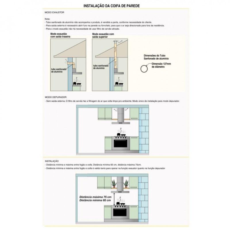 Coifa De Parede 80cm Vidro Reto Duto Slim Nardelli 110VDeixe sua cozinha mais moderna com a Coifa de parede Vidro Reto da Nardelli. Alem de pratica e bonita, possui a base e duto em inox e acompanha filtro de aluminio e filtro de carvao ativado. A coifa pode ser instalada de dois modos distintos, como exaustor ou como depurador. Com design diferenciado, possui vidro reto e temperado, que facilita sua limpeza, iluminacao com lampadas de led e tres velocidades. Traga mais versatilidade para sua cozinha.Para Fogao cooktop de 4 bocas e indicado coifa de 60 ou 70 cm.Para Fogao cooktop de 5 bocas e indicado coifa de 75, 80 ou 90 cm.Para Fogao cooktop de 6 bocas e indicado coifa de 90 cm ou mais.Observacao importante, sempre observar a largura do seu fogao, para que a largura da coifa seja sempre um pouco maior que o fogao cooktop.Instalacao apenas na ParedeObservacao, este modelo nao aceita instalacao no teto. Caso precise de coifa para instalar no teto, basta pesquisar por Coifa de ilha, e colocar a marca desejadaAtencao verifique a voltagem escolhida antes de finalizar sua compraCaracteristicasFuncao depurador ou exaustorFiltro interno de carvao ativadoFiltro externo metalico em aluminio e lavavelPainel de funcoes Easy Touch com 3 velocidadesIluminacao com lampadas de LedSuccao 550 m³hSuporte de fixacao acompanha a coifaDuto dividido em superior e inferior com regulagem de altura. min 68 cm e max 100 cm ja considerando a altura da base da coifaDuto superior possui abertura para ventilacao, quando usado no modo depuradorEspecificacoes TecnicasPotencia lampada 1 W cada umaConsumo 0,142 kWhDimensoesAltura total de 100 cm, com regulagem entre 68 cm e 100 cm, ja considerando a base da coifaLargura vidro 80 cm, vidro ponta a pontaProfundidade vidro 45 cmAltura base 4 cmLargura base 42 cmProfundidade base 37,5 cmPeso 11,45 kgDimensoes do duto L 21 cm x P 20,5 cm. Sao dois dutos em aco inox de 50 cm de altura cada umGarantia de Fabrica 12 mesesInstalacao por conta do clienteImagens meramente ilustrativasAtencao, o tubo sanfonado para exaustao, NAO acompanha o produto, Vendemos o tubo separadamente. O diametro de saida para o mesmo e de 127 mm de circunferenciaAs dimensoes do produto podem sofrer uma pequena variacao de largura do vidro, de ate 7 sete milimetros. Por este motivo, quando a coifa for instalada de forma embutida em nichos, o fabricante recomenda que seja considerada uma folga de pelo menos 1 cm em cada ladoPara cozinhas com pe direito superior a 2,65 m, temos disponivel para venda a parte, um modelo de duto complementar em aco inox escovado.Sua coifa ja vai pronta para utilizar como depurador pois ja possui internamente filtro de carvao ativado. Caso deseje utilizar como exaustor com saida de ar externa, onde sera necessario fazer uma abertura na parede, apenas precisara comprar e instalar o tubo sanfonado de aluminio flexivel que temos disponivel para venda.