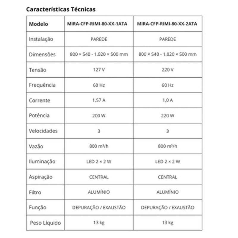 Coifa De Parede Mira 80cm CFP-RIMI-80-XX-1ATA 110VA Coifa de Parede Mira de 80cm é a solução perfeita para manter sua cozinha livre de fumaça e odores. Com um elegante acabamento em aço inox escovado, ela foi projetada para combinar com a estética da sua casa, sendo ideal para fogões de até 5 queimadores.Este modelo oferece a versatilidade de duas funções: exaustor e depurador. Na função exaustor, a coifa retira fumaça e gordura, expelindo-as para fora do ambiente. Já na função depurador, ela filtra os odores e devolve o ar limpo para a cozinha, garantindo um ambiente sempre agradável.Com controle por botões pulsantes, você pode ajustar a sucção em 3 velocidades diferentes, e as 2 lâmpadas de LED integradas proporcionam excelente visibilidade enquanto você cozinha.Características e Funcionalidades:Instalação: ParedeFuncionamento: Depurador e ExaustorControle: Comando pulsanteVelocidades: 3 opções de sucçãoIluminação: 2 lâmpadas de 12V e 20WFiltros: 3 filtros de alumínio e 2 filtros de carvão redondos (fixação central)Ideal para: Fogões de até 5 queimadoresEspecificações Técnicas:Marca: MiraReferência: COI RIMI9180X1Tamanho: 80 cmCor: Aço inox escovadoVazão: 800 m³/hVazão Livre: 1200 m³/hTensão: 110VPeso: 16 kgDimensões do Produto (LxAxP): 80 cm x 55 a 99 cm x 48 cm