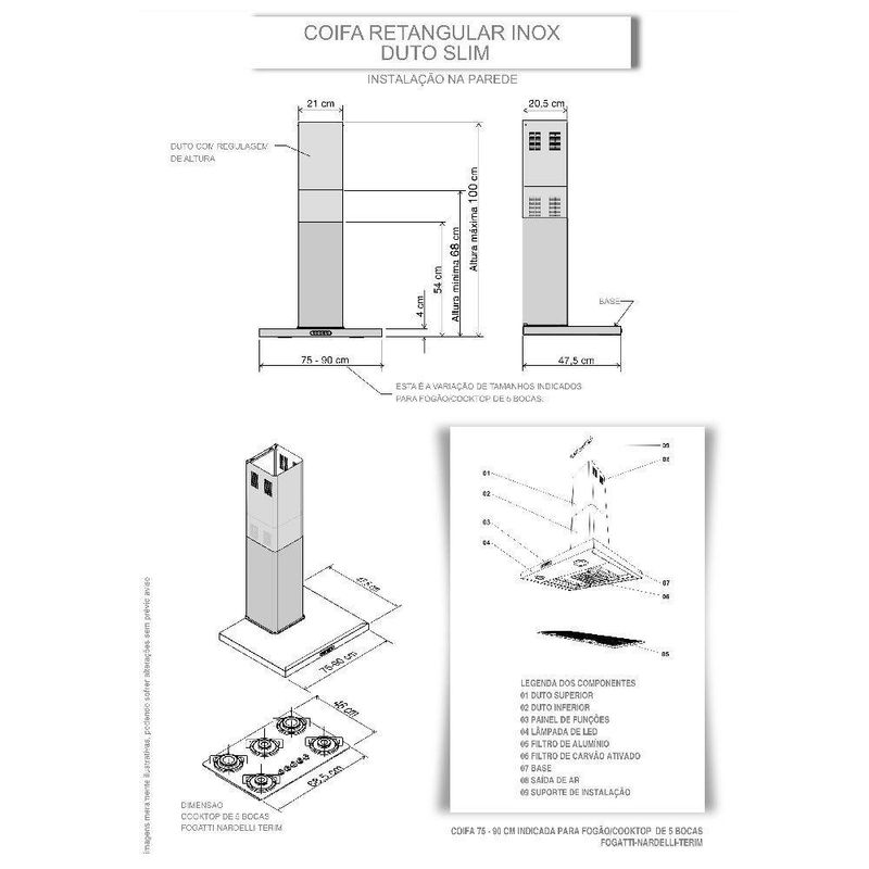 Coifa De Parede Retangular 75cm Slim Terim Preto Com Inox 220vDeixe sua cozinha mais moderna com a Coifa de parede Retangular da Terim. Alem de pratica e bonita, possui a base preta e duto inox e acompanha filtro de aluminio e filtro de carvao ativado. A coifa pode ser instalada de dois modos distintos, como exaustor ou como depurador. Com design diferenciado que facilita sua limpeza, iluminacao com lampadas de led e tres velocidades. Traga mais versatilidade para sua cozinha.Para Fogao cooktop de 4 bocas e indicado coifa de 60 ou 70 cm. Para Fogao cooktop de 5 bocas e indicado coifa de 75, 80 ou 90 cm. Para Fogao cooktop de 6 bocas e indicado coifa de 90 cm ou mais. Observacao importante, sempre observar a largura do seu fogao, para que a largura da coifa seja sempre um pouco maior que o fogao cooktop. Instalacao apenas na Parede Observacao, este modelo nao aceita instalacao no teto. Caso precise de coifa para instalar no teto, basta pesquisar por Coifa de ilha, e colocar a marca desejada Atencao verifique a voltagem escolhida antes de finalizar sua compra Caracteristicas Funcao depurador ou exaustor Filtro interno de carvao ativado Filtro externo metalico em aluminio e lavavel Painel de funcoes Easy Touch com 3 velocidades Iluminacao com lampadas de Led Succao 550 m³h Suporte de fixacao acompanha a coifa Duto dividido em superior e inferior com regulagem de altura. min 68 cm e max 100 cm ja considerando a altura da base da coifa Duto superior possui abertura para ventilacao, quando no modo depurador Especificacoes Tecnicas Frequencia 60 Hz Ruido 65 dB Potencia do motor 140 W Potencia total 142 W Velocidades 3 Potencia lampada 1 W cada uma Consumo 0,142 kWh Dimensoes Altura total de 100 cm, com regulagem entre 68 cm e 100 cm, ja considerando a base da coifa Largura 75 cm Profundidade 47,5 cm Altura base 4 cm Peso 10,25 kg Dimensoes do duto L 21 cm x P 20,5 cm. Sao dois dutos em inox de 50 cm de altura cada um Garantia de Fabrica 12 meses Instalacao por conta do cliente Imagens meramente ilustrativas Atencao, o tubo sanfonado para exaustao, NAO acompanha o produto, Vendemos o tubo separadamente. O diametro de saida para o mesmo e de 127 mm de circunferencia Para cozinhas com pe direito superior a 2,65 m, temos disponivel para venda a parte, um modelo de duto complementar em aco inox escovado. Sua coifa ja vai pronta para utilizar como depurador pois ja possui internamente filtro de carvao ativado. Caso deseje utilizar como exaustor com saida de ar externa, onde sera necessario fazer uma abertura na parede, apenas precisara comprar e instalar o tubo sanfonado de aluminio flexivel que temos disponivel para venda.