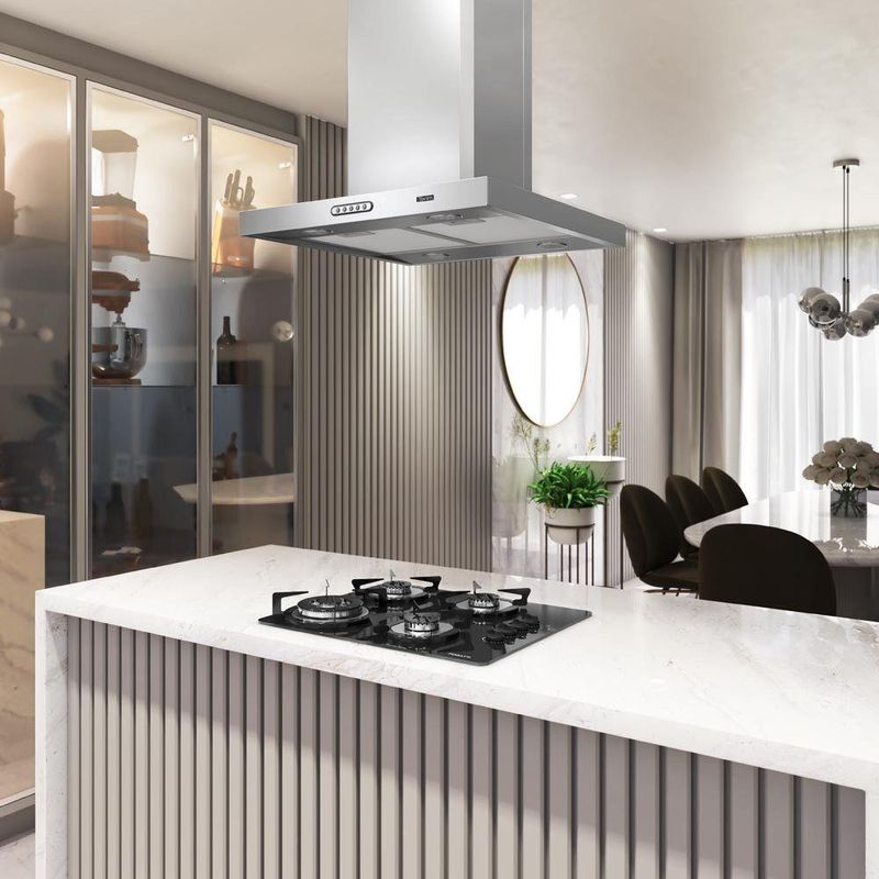 Coifa Ilha 60cm Retangular Terim Inox 110vDeixe sua cozinha mais moderna com a Coifa de Ilha Retangular da Terim Alem de pratica e bonita, possui a base e dutos em inox e acompanha filtro de aluminio e filtro de carvao ativado. A coifa pode ser instalada de dois modos distintos, como exaustor ou como depurador. Com design diferenciado, que facilita sua limpeza, iluminacao com lampadas de led e tres velocidades. Traga mais versatilidade para sua cozinha.Para Fogao cooktop de 4 bocas e indicado coifa de 60 ou 70 cm Para Fogao cooktop de 5 bocas e indicado coifa de 75, 80 ou 90 cm Para Fogao cooktop de 6 bocas e indicado coifa de 90 cm ou mais Observacao importante, sempre observar a largura do seu fogao, para que a largura da coifa seja sempre um pouco maior que o fogao cooktop Instalacao apenas em Ilha, no Teto Caracteristicas Funcao depurador ou exaustor Filtro interno de carvao ativado Filtro externo metalico em aluminio e lavavel Painel de funcoes Easy Touch com 3 velocidades Iluminacao com lampadas de Led Succao 700 m³h no modo depurador e 900 m³h no modo exaustor Suporte de fixacao acompanha a coifa Duto dividido em superior e inferior com regulagem de altura. min 65 cm e max 85 cm de duto. Se considerar a a base da coifa, chega a altura total de 90 cm. Duto superior possui abertura para ventilacao, quando no modo depurador Especificacoes Tecnicas Frequencia 60 Hz Ruido 65 dB Potencia do motor 240 W Potencia total 244 W Velocidades 3 Potencia lampada 1 W cada uma Consumo 0,244 kWh Dimensoes Altura total de 90 cm, com regulagem entre 65 cm e 90 cm, ja considerando a base da coifa Largura 60 cm Profundidade 60 cm Altura base 5,0 cm Peso 26,40 kg Dimensoes do duto L 32 cm x P 28 cm, dividido em duas partes Garantia de Fabrica 12 meses Instalacao por conta do cliente Imagens meramente ilustrativas Atencao O Tubo sanfonado para exaustao, NAO acompanha o produto, Vendemos o tubo separadamente. O diametro de saida para o mesmo e de 150 mm de circunferencia Para cozinhas com pe direito superior a 2,55 m. Temos disponivel para venda a parte, alguns tamanhos de dutos especiais. Nas imagens do anuncio disponibilizamos a informacao das medidas dos dutos especiais. Sua coifa ja vai pronta para utilizar como depurador pois ja possui internamente o filtro de carvao ativado. Caso deseje utilizar como exaustor com saida de ar externa, onde sera necessario fazer uma abertura na parede, apenas precisara comprar e instalar o tubo sanfonado de aluminio flexivel que temos disponivel para venda.