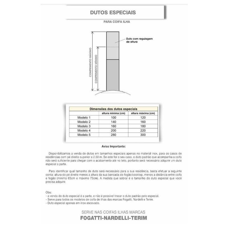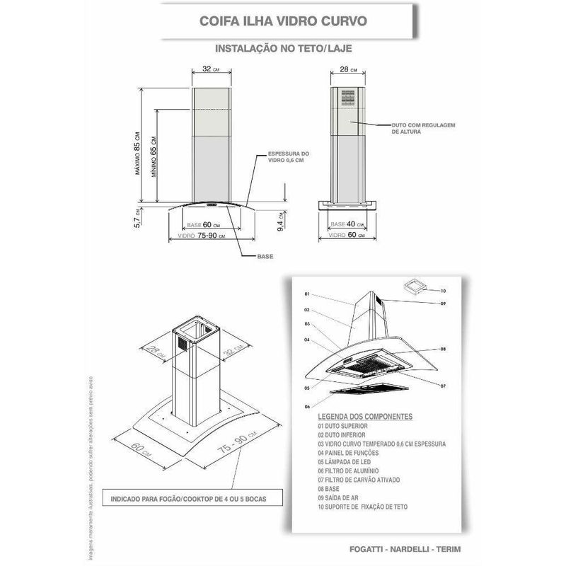 Coifa Ilha 75cm Vidro Curvo Fogatti Inox 220vDeixe sua cozinha mais moderna com a Coifa de Ilha Vidro Curvo da Fogatti Além de prática e bonita, possui a base e dutos em inox escovado e acompanha filtro de alumínio e filtro de carvão ativado. A coifa pode ser instalada de dois modos distintos, como exaustor ou como depurador. Com design diferenciado, possui vidro curvo e temperado, que facilita sua limpeza, iluminação com lâmpadas de led e três velocidades. Traga mais versatilidade para sua cozinha. Para Fogão cooktop de 4 bocas é indicado coifa de 60 ou 70 cm Para Fogão cooktop de 5 bocas é indicado coifa de 75, 80 ou 90 cm Para Fogão cooktop de 6 bocas é indicado coifa de 90 cm ou mais Obs importante sempre observar a largura do seu fogão, para que a largura da coifa seja sempre um pouco maior que o fogão cooktop Instalação apenas em Ilha, no Teto Atenção escolha a voltagem do produto antes de finalizar a compra Características Função depurador ou exaustor Filtro interno de carvão ativado Filtro externo metálico em alumínio e lavável Painel de funções Easy Touch com 3 velocidades Iluminação com lâmpadas de Led Sucção 700 m³h no modo depurador e 900 m³h no modo exaustor Suporte de fixação acompanha a coifa Duto dividido em superior e inferior com regulagem de altura. mín 65 cm e máx 85 cm de duto. Se considerer a a base da coifa, chega a altura total de 90 cm. Duto superior possui abertura para ventilação, quando usado no modo depurador Especificações Técnicas Tensão 127V ou 220V, a voltagem deve ser escolhida e selecionada no ato da compra Frequência 60 Hz Ruído 65 dB Potência do motor 240 W Potência total 244 W Velocidades 3 Potência lâmpada 1 W cada uma Consumo 0,244 kWh Dimensões Altura total de 90 cm, com regulagem entre 65 cm e 90 cm, já considerando a base da coifa Largura vidro 75 cm, vidro ponta a ponta Profundidade vidro 60 cm Altura base 5,7 cm Largura base 60 cm Profundidade base 40 cm Peso 27,80 kg Dimensões do duto L 32 cm x P 28 cm, dividido em duas partes Garantia de Fábrica 12 meses Instalação por conta do cliente Imagens meramente ilustrativas Atenção O Tubo sanfonado para exaustão, NÃO acompanha o produto, Vendemos o tubo separadamente. O diâmetro de saída para o mesmo é de 150 mm de circunferência As dimensões do produto podem sofrer uma pequena variação de largura do vidro, de até 7 sete milímetros. Por este motivo, quando a coifa for instalada de forma embutida em nichos, o MANUFACTURER recomenda que seja considerada uma folga de pelo menos 1 cm em cada lado Para cozinhas com pé direito superior a 2,55 m. Temos disponível para venda à parte, alguns tamanhos de dutos especiais. Nas imagens do anúncio disponibilizamos a informação das medidas dos dutos especiais. Sua coifa já vai pronta para utilizar como depurador pois já possui internamente o filtro de carvão ativado. Caso deseje utilizar como exaustor com saída de ar externa, onde será necessário fazer uma abertura na parede, apenas precisará comprar e instalar o tubo sanfonado de alumínio flexível que temos disponível para vendaCOLOR: COLOR Voltagem: Voltagemundefined