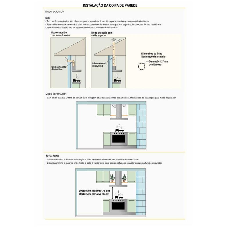 Coifa Terim De Parede Clean Vidro Curvo Kromanox 75cm Kromanox 220vA nova Coifa de Vidro Curvo Clean Kromanox foi desenhada com cuidado, pensando nos detalhes e deixando a sua cozinha mais pratica e elegante. Possui 3 opcoes de velocidade de succao, acionadas por um painel de facil acionamento e design mais leve. Com a tecnologia no fingerprint as marcas de dedo ficaram no passado, alem do material base ser de altissima resistencia a corrosao. Os LEDs iluminam seu preparo com muito mais eficiencia e combinam com os tracos minimalista da colecao. O filtro de aluminio e lavavel e no interno do produto acompanha filtro de carvao ativado para garantir a qualidade do ar puro no ambiente.Para Fogao cooktop de 4 bocas e indicado coifa de 60 ou 70 cm. Para Fogao cooktop de 5 bocas e indicado coifa de 75, 80 ou 90 cm. Para Fogao cooktop de 6 bocas e indicado coifa de 90 cm ou mais. Observacao importante, sempre observar a largura do seu fogao, para que a largura da coifa seja sempre um pouco maior que o fogao cooktop. Instalacao apenas na Parede Observacao, este modelo nao aceita instalacao no teto. Caso precise de coifa para instalar no teto, basta pesquisar por Coifa de ilha, e colocar a marca desejada Atencao verifique a voltagem escolhida antes de finalizar sua compra Caracteristicas Funcao depurador ou exaustor Filtro interno de carvao ativado Filtro externo metalico em aluminio e lavavel Painel de funcoes Mecanico com 3 velocidades Iluminacao com lampadas de Led Succao 550 m³h No fingerprint - material exclusivo que nao deixa marcas de dedo na coifa Suporte de fixacao acompanha a coifa Duto dividido em superior e inferior com regulagem de altura. min 68 cm e max 100 cm ja considerando a altura da base da coifa Duto superior possui abertura para ventilacao, quando no modo depurador Especificacoes Tecnicas Frequencia 60 Hz Ruido 65 dB Potencia do motor 140 W Potencia total 146 W Velocidades 3 Potencia lampada 3 W cada uma Consumo 0,142 kWh Dimensoes Altura total de 100 cm, com regulagem entre 68 cm e 100 cm, ja considerando a base da coifa Largura vidro 75 cm, vidro ponta a ponta Profundidade vidro 45 cm Altura base 4 cm Largura base 57 cm Profundidade base 37,5 cm Peso 11,15 kg Dimensoes do duto L 21 cm x P 20,5 cm. Sao dois dutos em aco carbono pintado de 50 cm de altura cada um Garantia de Fabrica 12 meses Instalacao por conta do cliente Imagens meramente ilustrativas Atencao, o tubo sanfonado para exaustao, NAO acompanha o produto, Vendemos o tubo separadamente. O diametro de saida para o mesmo e de 127 mm de circunferencia As dimensoes do produto podem sofrer uma pequena variacao de largura do vidro, de ate 7 sete milimetros. Por este motivo, quando a coifa for instalada de forma embutida em nichos, o fabricante recomenda que seja considerada uma folga de pelo menos 1 cm em cada lado Para cozinhas com pe direito superior a 2,65 m, temos disponivel para venda a parte, um modelo de duto complementar em aco inox escovado. Sua coifa ja vai pronta para utilizar como depurador pois ja possui internamente filtro de carvao ativado. Caso deseje utilizar como exaustor com saida de ar externa, onde sera necessario fazer uma abertura na parede, apenas precisara comprar e instalar o tubo sanfonado de aluminio flexivel que temos disponivel para venda.