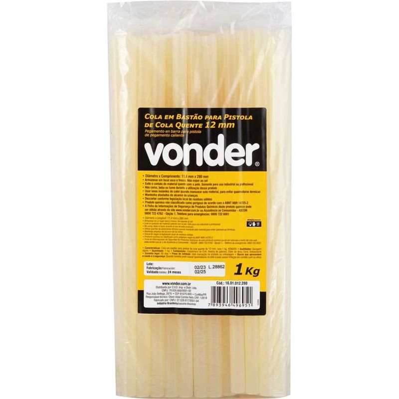 Cola em Bastão Para Pistola de Cola Quente de 12 mm, com 1 kg, Vonder OstenVonder - Conteúdo da embalagem: 1 Pacote com 1 kg. Aplicação: Para aplicação com pistolas de cola quente de 12 mm. Indicada para colagem de madeira, couro, papel, papelão, plástico, borracha, cerâmica, entre outros. Destaques: Possui secagem rápida. Referência: 200436 Garantia - E (CDC): Garantia legal: 90 dias Modelo: Cola em bastão Diâmetro do refil para pistola de cola quente: 11,4 mm Comprimento do refil para pistola de cola quente: 280,0 mm Quantidade aproximada de bastões na embalagem: 36 unidades Massa aproximada (peso): 1,03 kg Aspecto/aparência: Amarelada Destaques Comercial: Possui secagem rápida. Aplicação Comercial: Uso em pistolas de cola quente 12 mm; indicada para colar madeira, couro, papel, plástico, borracha e cerâmica. Características Gerais do Produto: Garantia: • 3 Meses