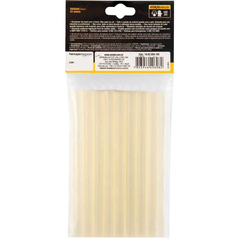 Cola em Bastão Para Pistola de Cola Quente de 8 mm, em Cartela, Vonder OstenVonder - Conteúdo da embalagem: 1 Cartela com 9 peças. Aplicação: Para aplicação com pistolas de cola quente de 8 mm. Indicada para colagem de madeira, couro, papel, papelão, plástico, borracha, cerâmica, entre outros. Destaques: Possui secagem rápida. Referência: 1602008100 Garantia - E (CDC): Garantia legal: 90 dias Modelo: Cola em bastão Diâmetro do refil para pistola de cola quente: 7,4 mm Comprimento do refil para pistola de cola quente: 100,0 mm Quantidade aproximada de bastões na embalagem: 9 unidades Massa aproximada (peso): 0,042 kg Aspecto/aparência: Amarelada Destaques Comercial: Possui secagem rápida. Aplicação Comercial: Uso em pistolas de cola quente 8 mm, indicada para colar madeira, couro, papel, papelão, plástico, borracha e cerâmica. Características Gerais do Produto: Garantia: • 3 Meses