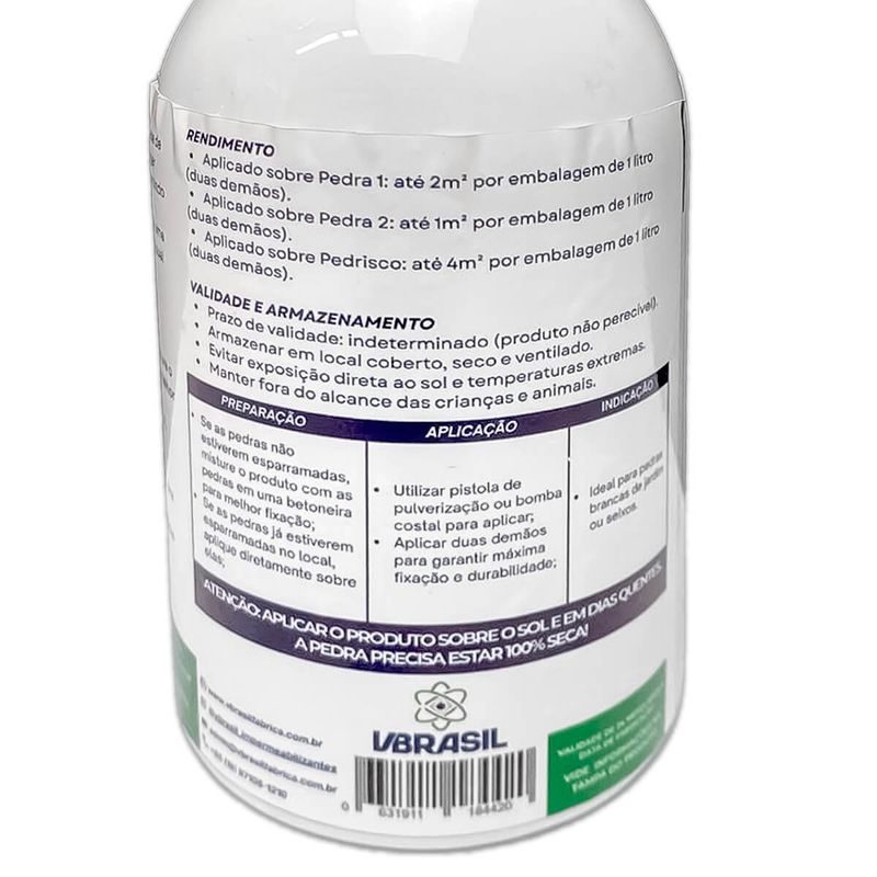 Descrição:A Cola Pedra VBrasil 500ml é um selante líquido inovador à base de nanotecnologia, desenvolvido para fixar, proteger e realçar pedras decorativas em jardins e paisagismos. Sua fórmula especial cria uma película transparente e resistente, mantendo o aspecto natural das pedras e evitando deslocamentos causados por chuva, vento ou pisoteio. Com alto rendimento e fácil aplicação, o produto proporciona fixação duradoura, além de ser hidrofugante, ecológico, não tóxico e evitar a formação de mofo, garantindo beleza e proteção prolongada ao ambiente externo.Informações Técnicas:Hidrofugante e permeávelEcológico e não tóxicoEvita mofoTransparente após a secagemFácil de aplicarAlta durabilidadeRendimento Aproximado (duas demãos):Pedra 1: até 2 m² por litroPedra 2: até 1 m² por litroPedrisco: até 4 m² por litroModo de Aplicação:Preparação:Caso as pedras ainda não estejam no local, misture o produto com as pedras em uma betoneira para melhor fixação.Se as pedras já estiverem dispostas, aplique o produto diretamente sobre elas.Aplicação:Utilize pistola de pulverização ou bomba costal para espalhar o produto.Aplique duas demãos para garantir máxima aderência e durabilidade.Realize a aplicação em dias secos e com pedras completamente secas, evitando o sol intenso no momento da aplicação.Indicação:Ideal para pedras brancas, seixos e pedriscos decorativos utilizados em jardins e áreas externas.Itens Inclusos:1x Cola Pedra VBrasil 500ml